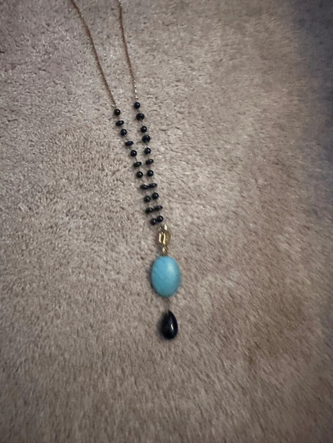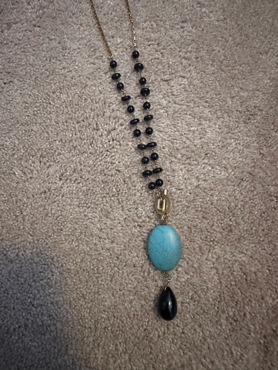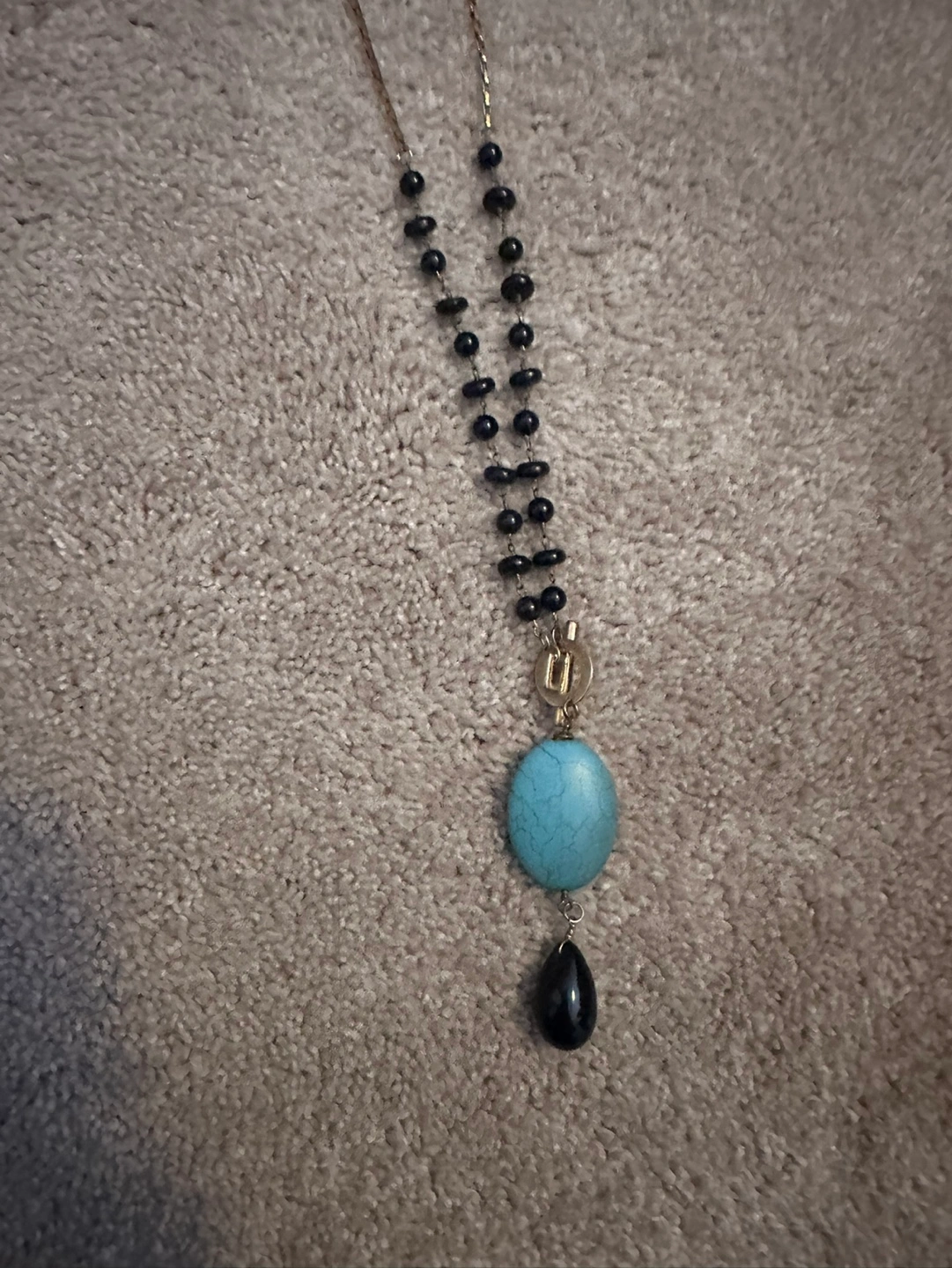 Never used Elegant necklace featuring black beads and a turquoise pendant. Gold-toned accents. Lovely statement piece.