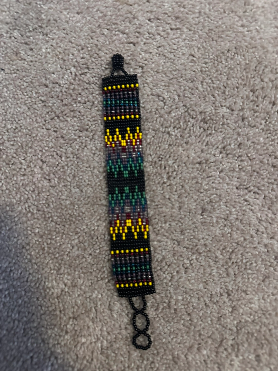 Never used Unique handmade beaded bracelet. Features colourful geometric patterns on a black background. Adjustable clasp.