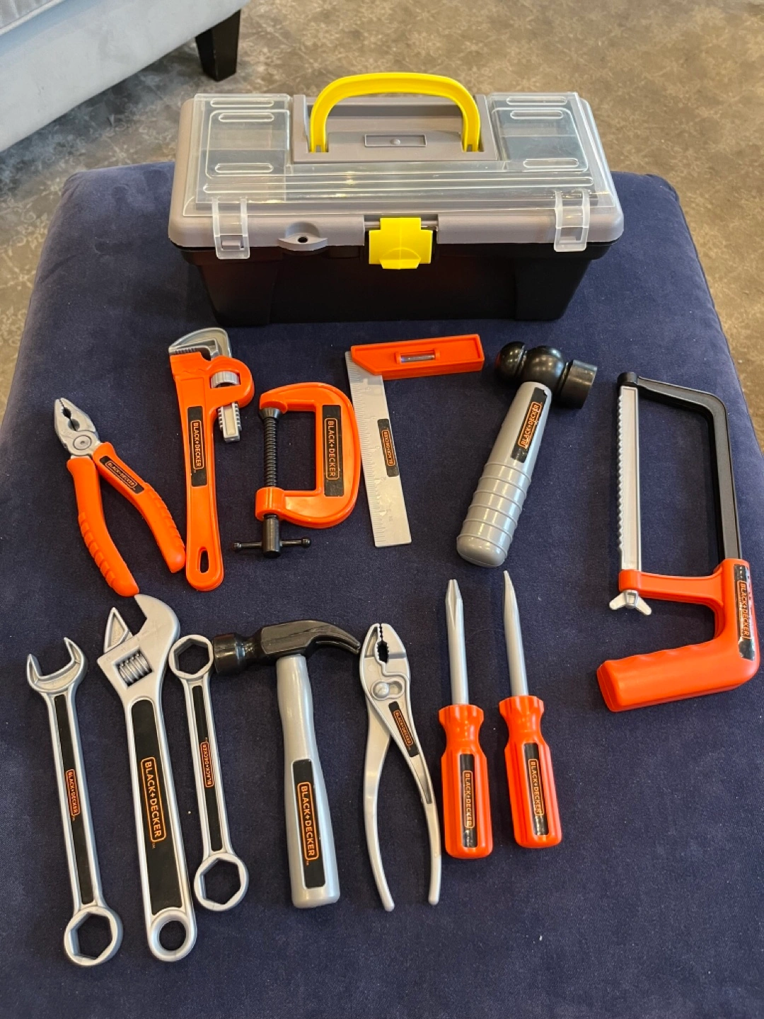 Play tool set, plastic tools. Includes various hand tools, stored in a plastic carrying case. Great for imaginative play. Cash only