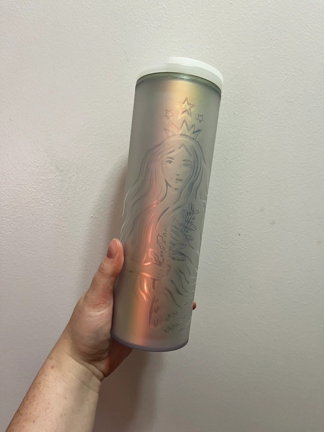 Lightly used insulated 16oz tumbler with a beautiful iridescent mermaid design Top swivels open to reveal the spout, twist to shut. LOCATION: This item is for pickup at my home near King St West and Jameson Avenue in Parkdale (exact address is only given for confirmed pickups), or inside Yonge Sheppard Centre during my weekday work hours.