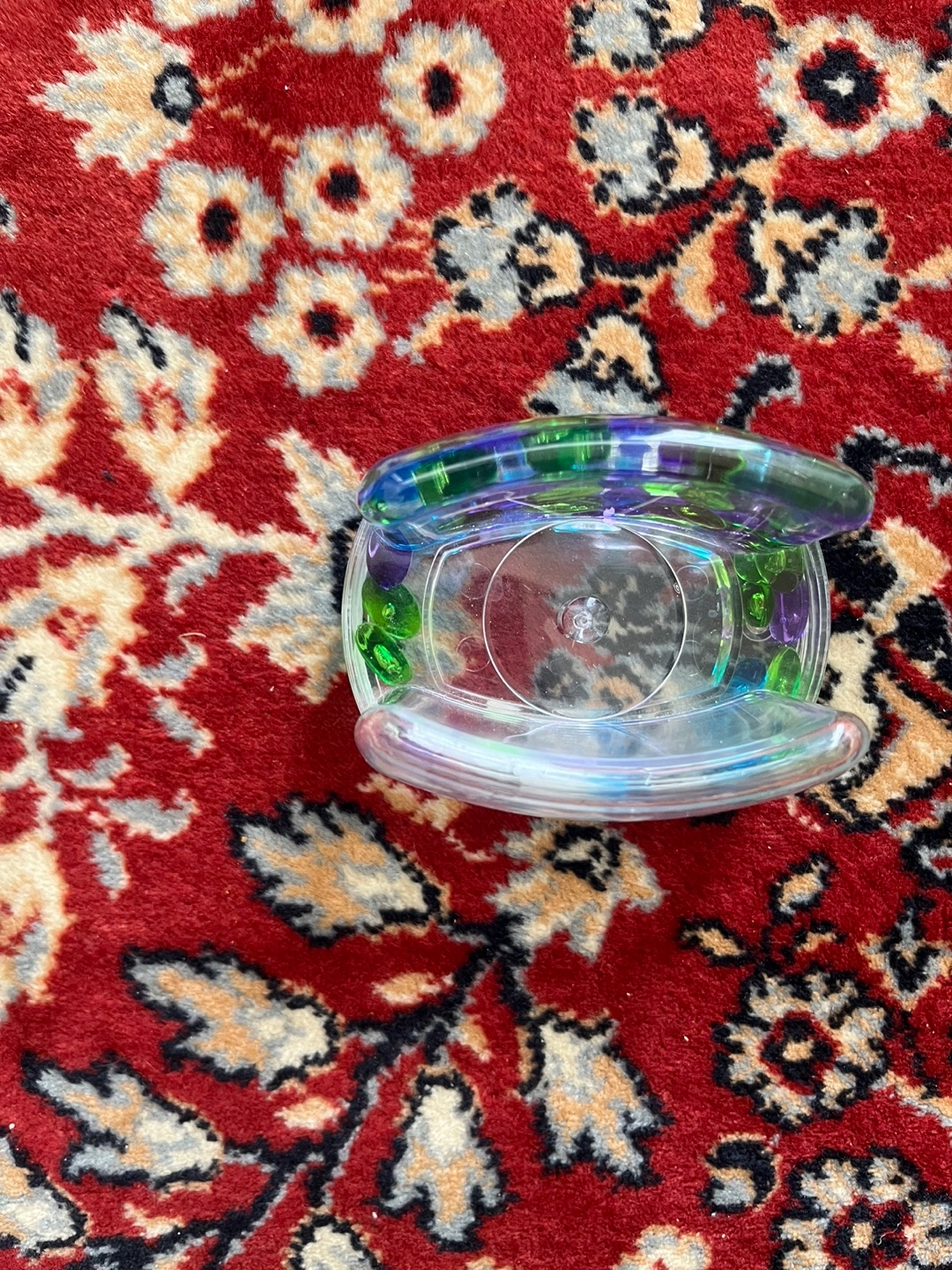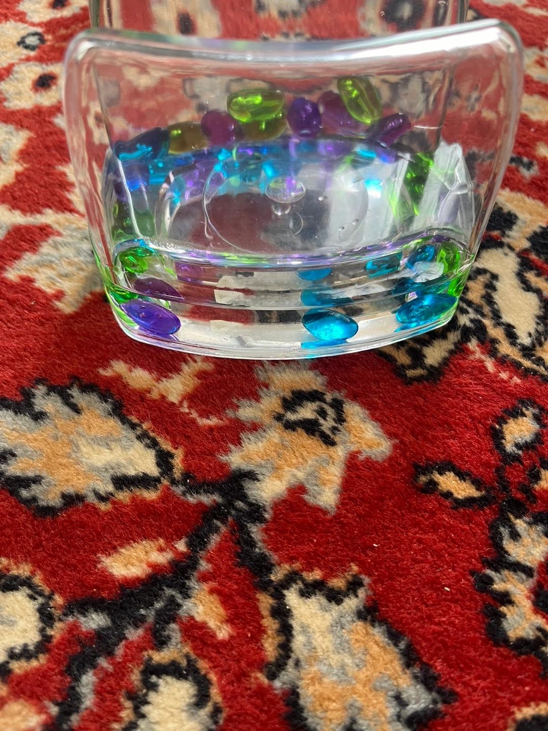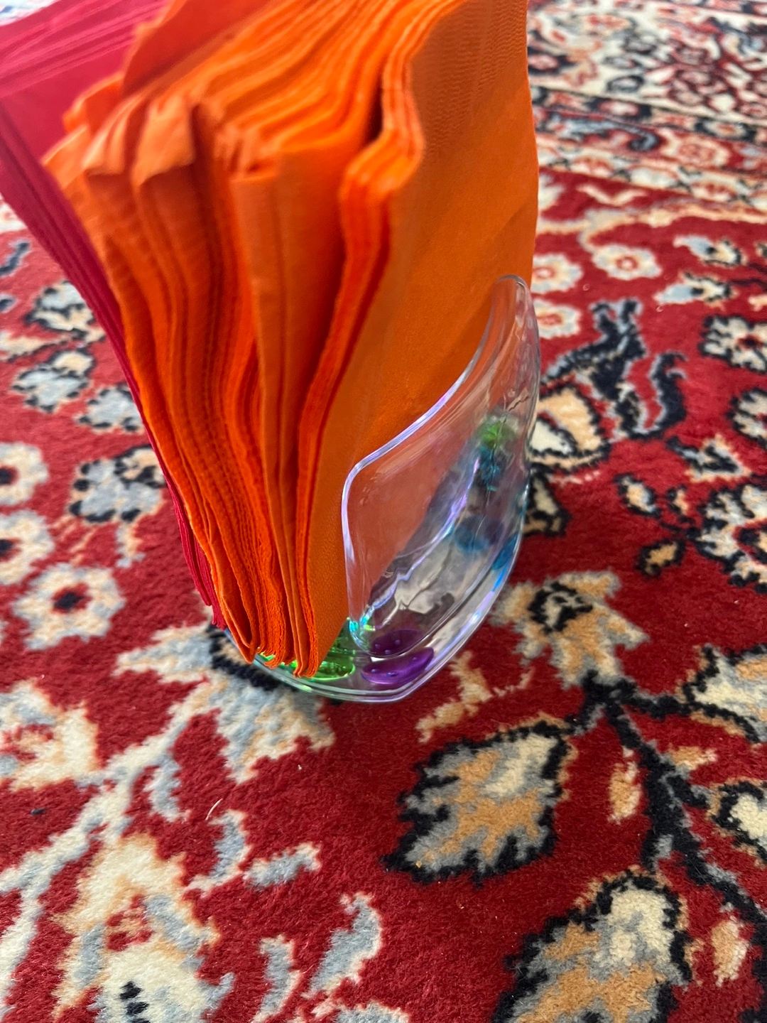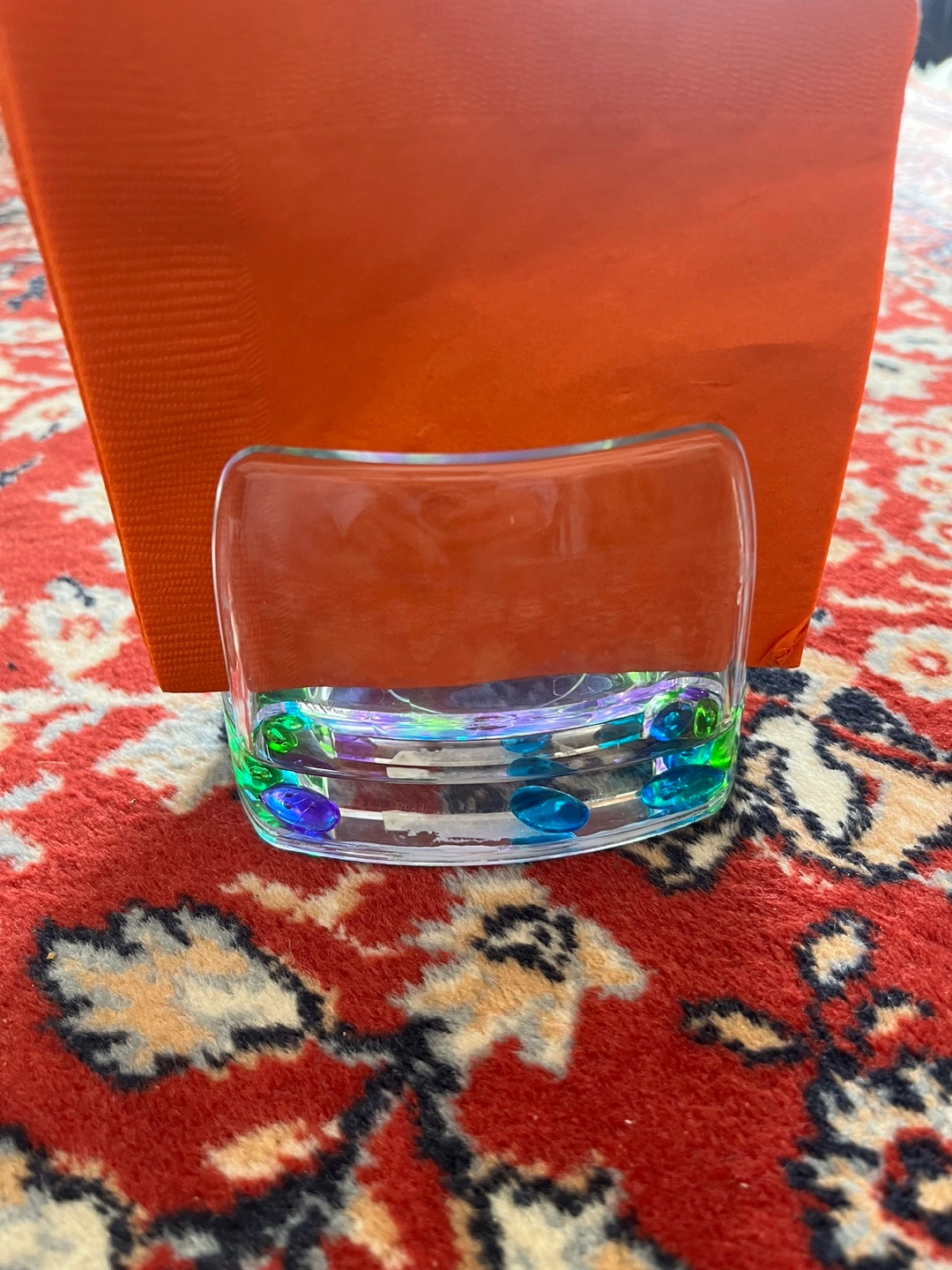 Unique napkin holder. Clear glass construction. Holds napkins. Features colourful beads inside. Stylish addition to any table.
