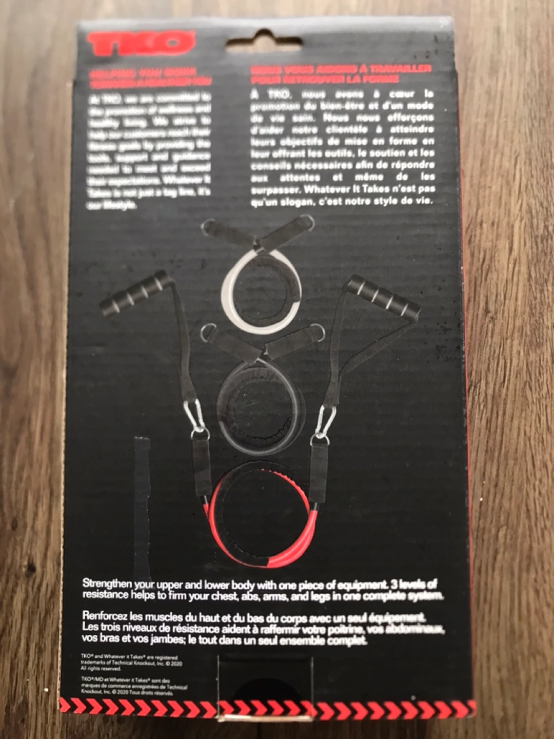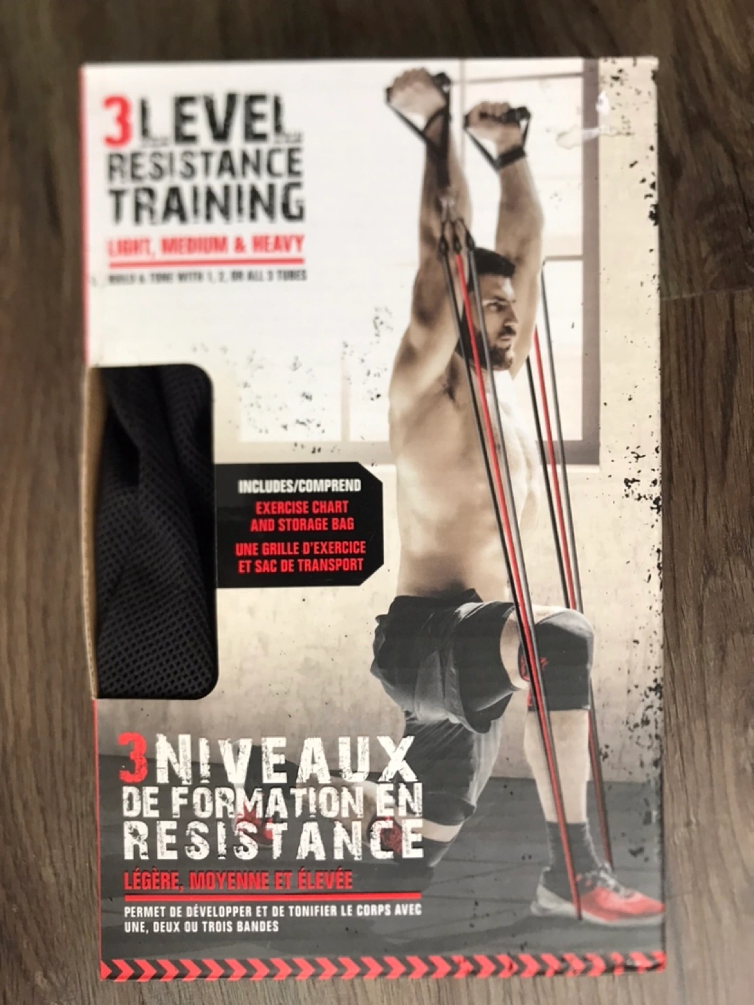 Still sealed in box: Workout system. Includes three resistance bands, handles, and storage bag. Strengthens upper and lower body. Three levels of resistance: light, medium, and heavy.