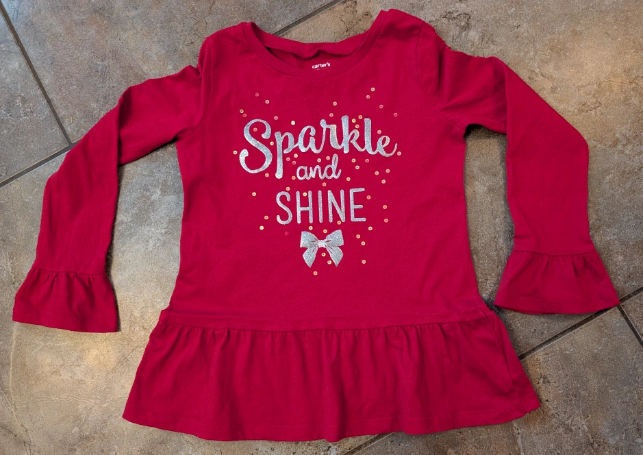 Brand New without tags Girl's Size 10 red "Sparkle and Shine" shirt has long sleeves with ruffled cuffs, bottom frill and sequins & glitter on the front. Made by Carter's. Perfect for Christmas, Valentine's or anytime.