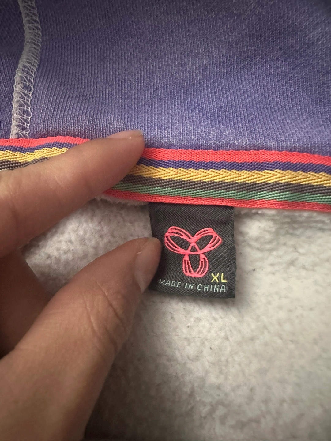 RVCA zip-up hoodie. Size XL. Purple and white graphic print. Made in China.