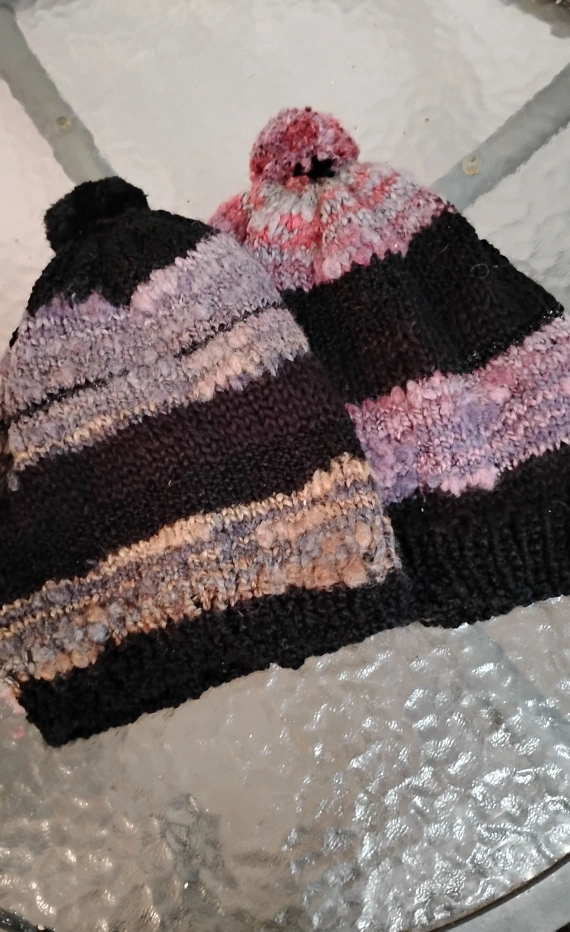 Pair of hand-knitted winter hats. Multicoloured stripes, pom-poms. sold as Set $30 or $20 each