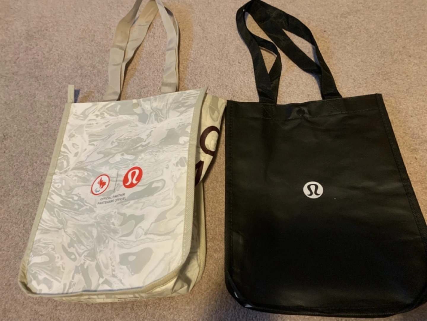 NEW Pair of reusable shopping bags. One is off-white marble pattern with Olympic Partner branding. The other is black with the Lululemon logo. -Great for shopping or the gym or as a lunch bag -Features Lululemon logo