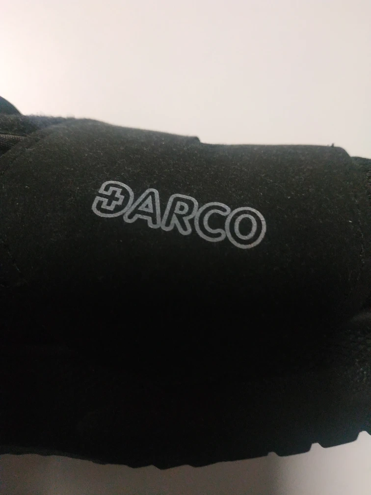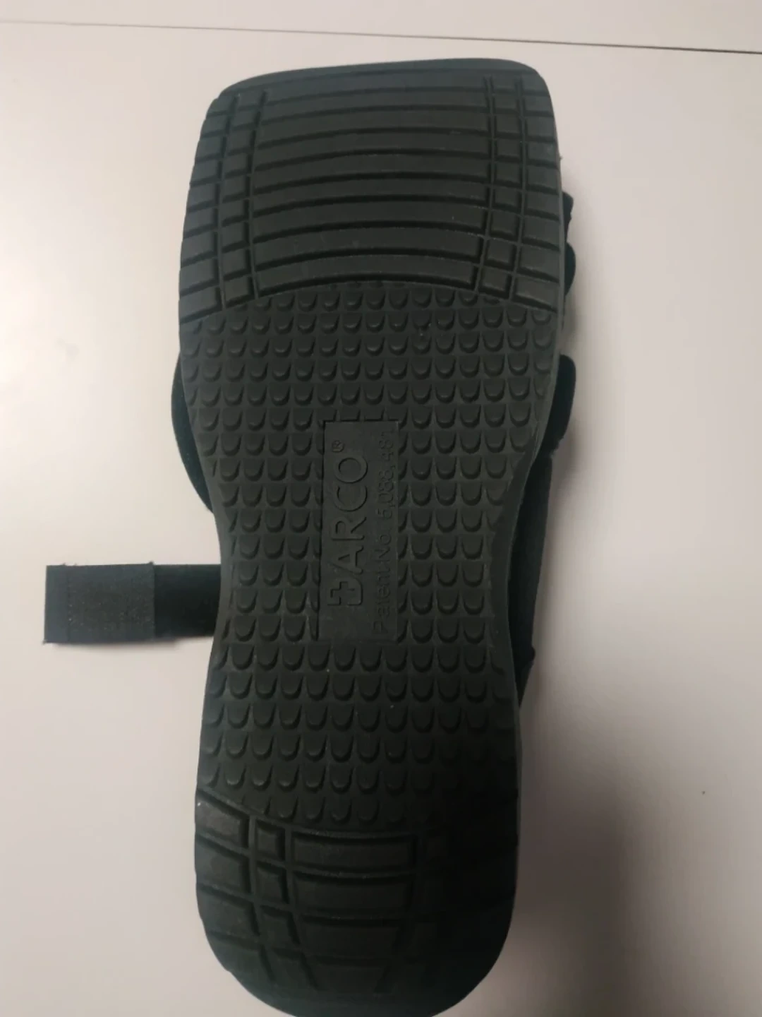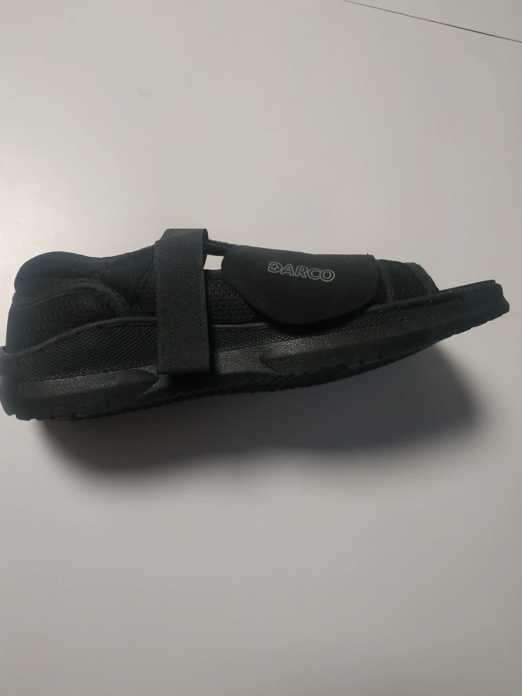 Black post-operative shoe. Features adjustable straps and breathable mesh. Durable sole. Suitable for recovery. Size fits medium to larger foot. New never used.... paid $107. after taxes.