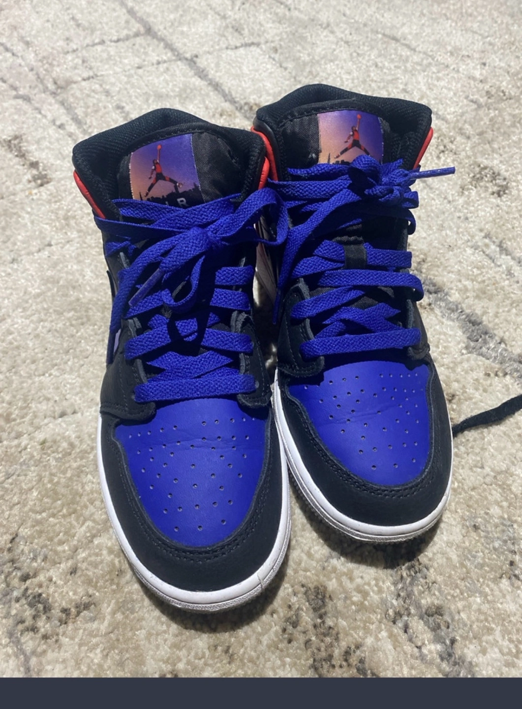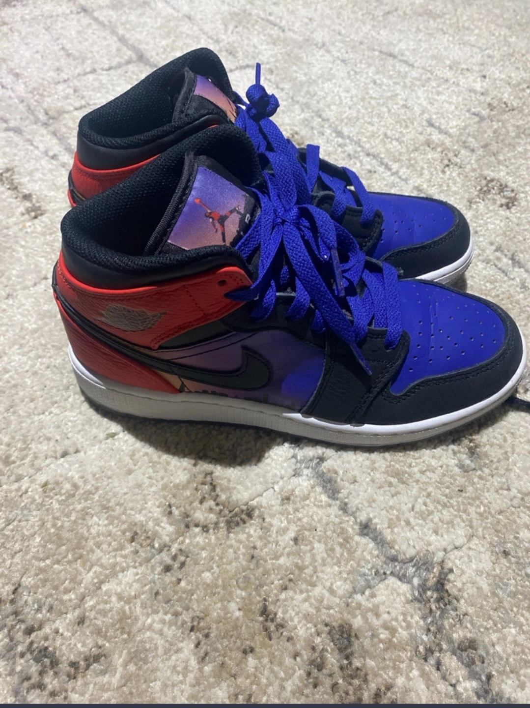 Kids' Air Jordan 1 Mid. Black, red, and blue colourway. Sunset graphic on the tongue. Purple accents. Size 4Y.
