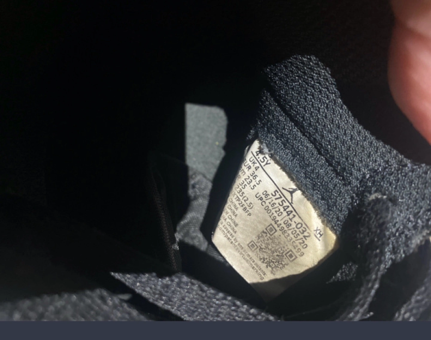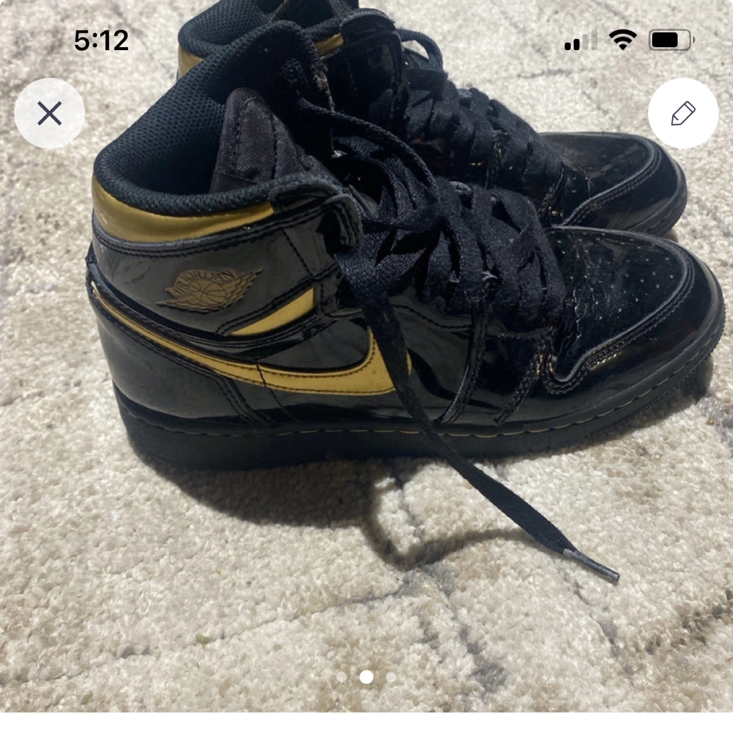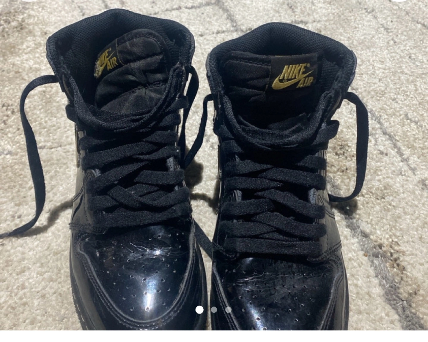 Black and gold patent leather Air Jordan 1 high top sneakers. Size youth 5.5Y. Pre-owned.