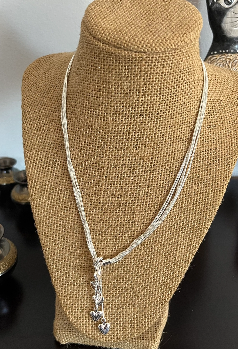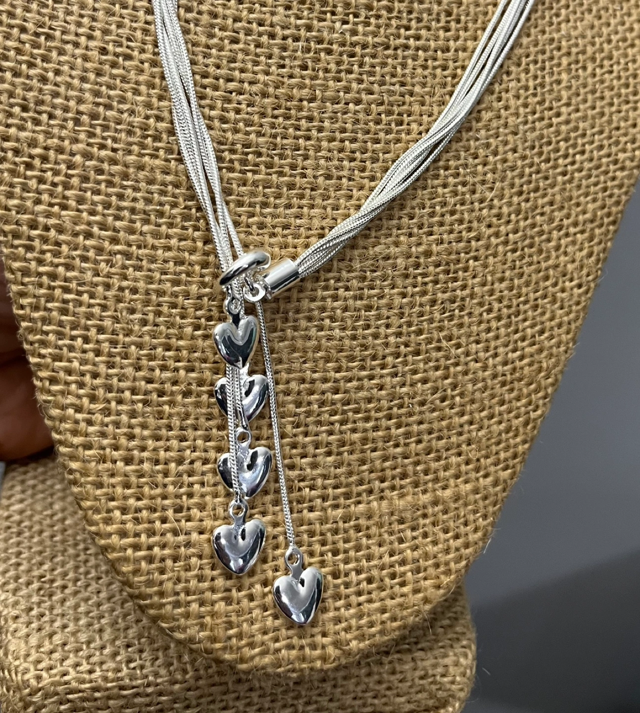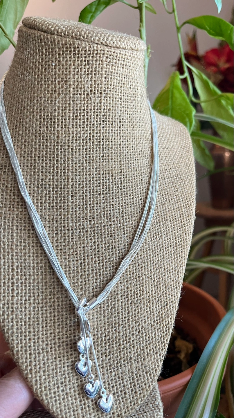 Beautiful silver necklace. Features multiple strands and a dangling heart charms. Elegant and stylish. Secure clasp.