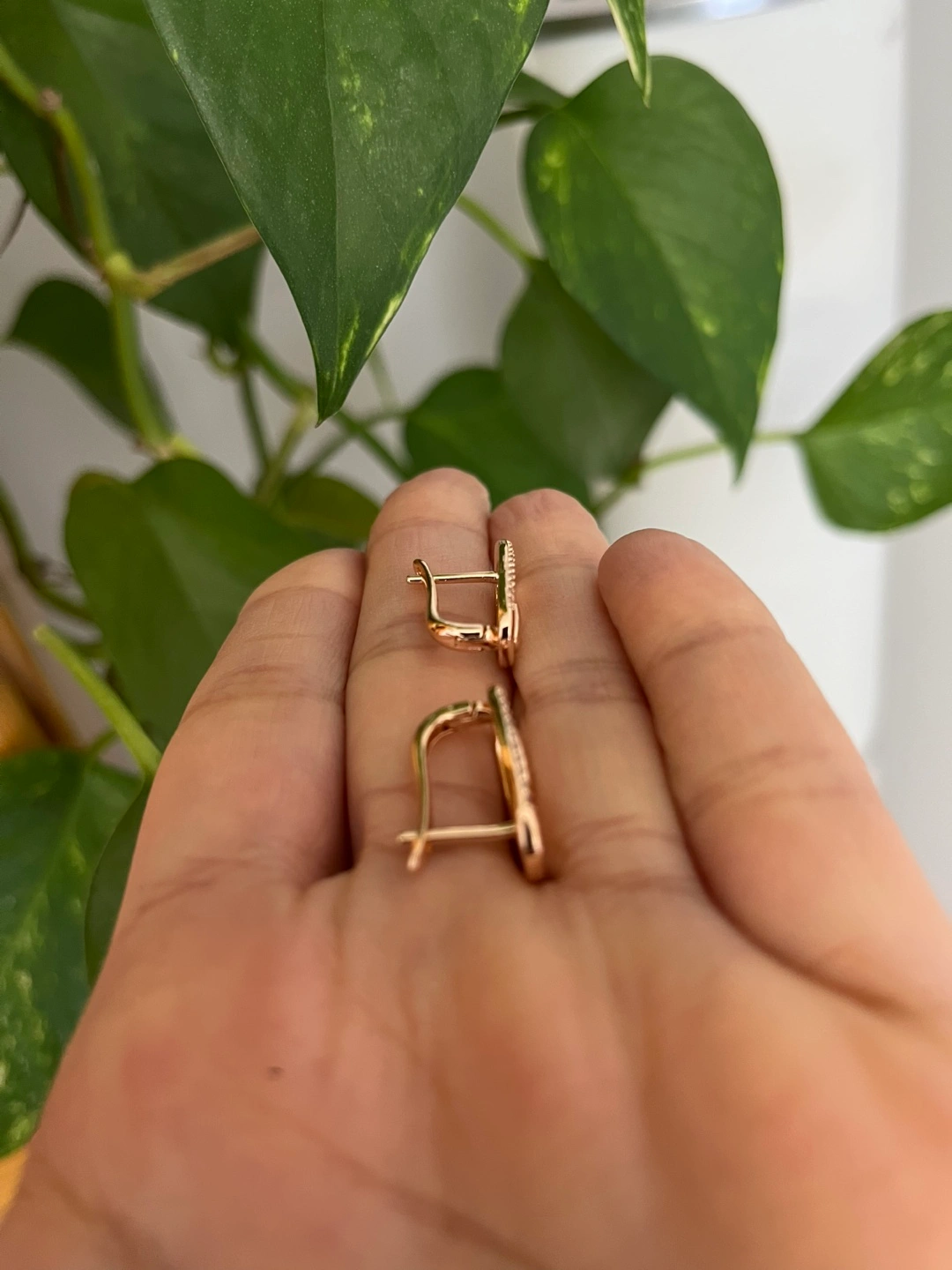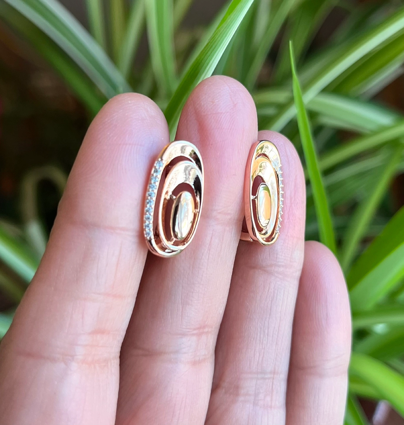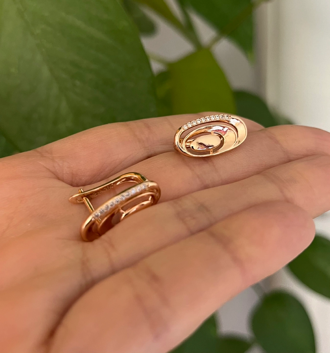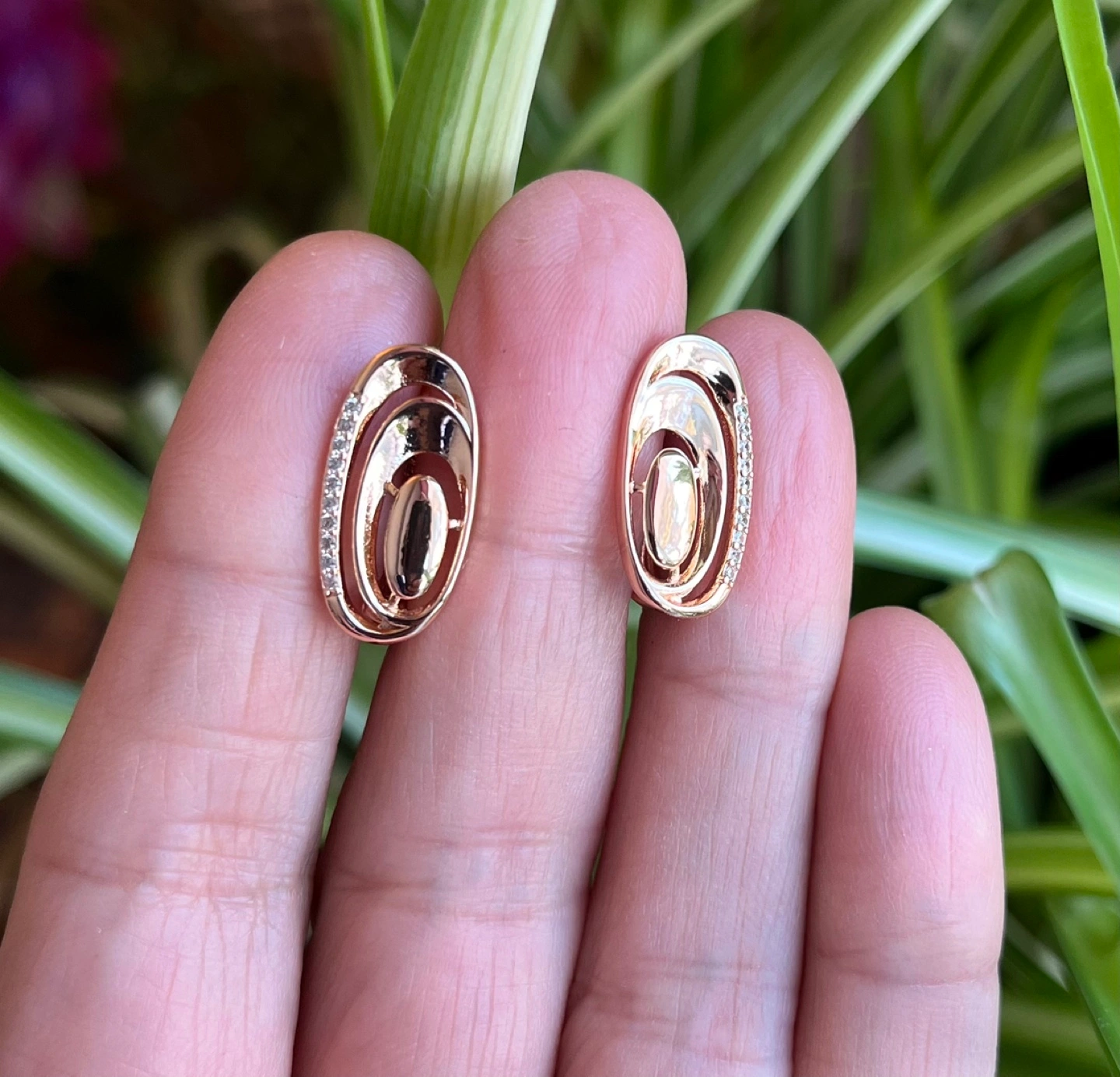 Elegant rose gold earrings. Oval shape. Features cubic zirconia accents. Beautiful and delicate design. Perfect for everyday wear or special occasions. Close to MTC