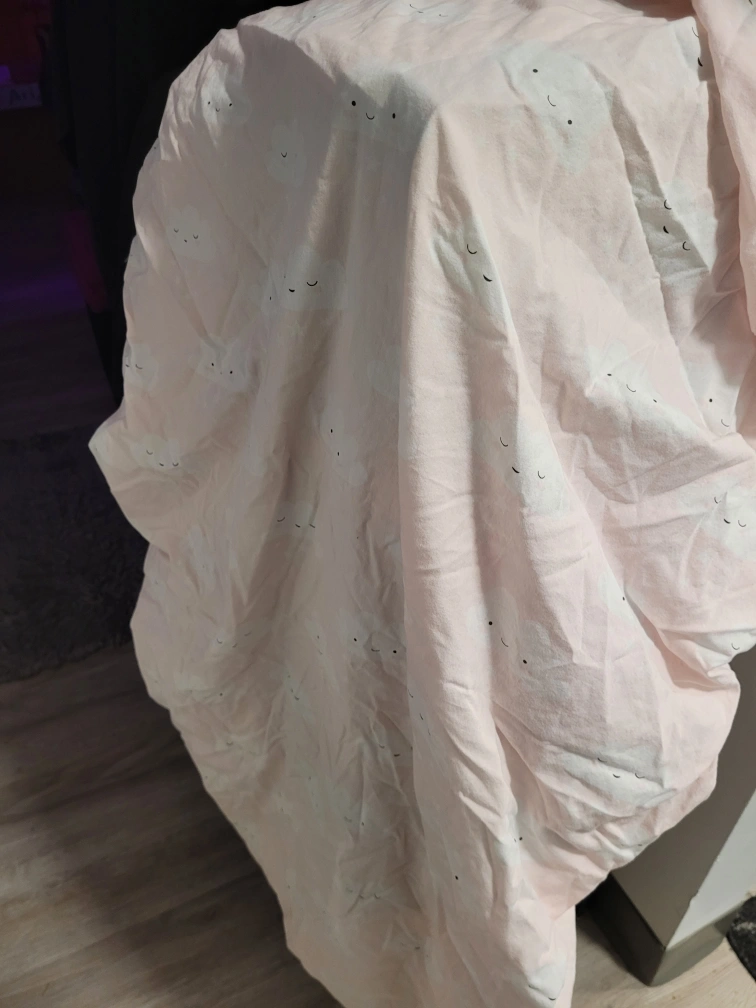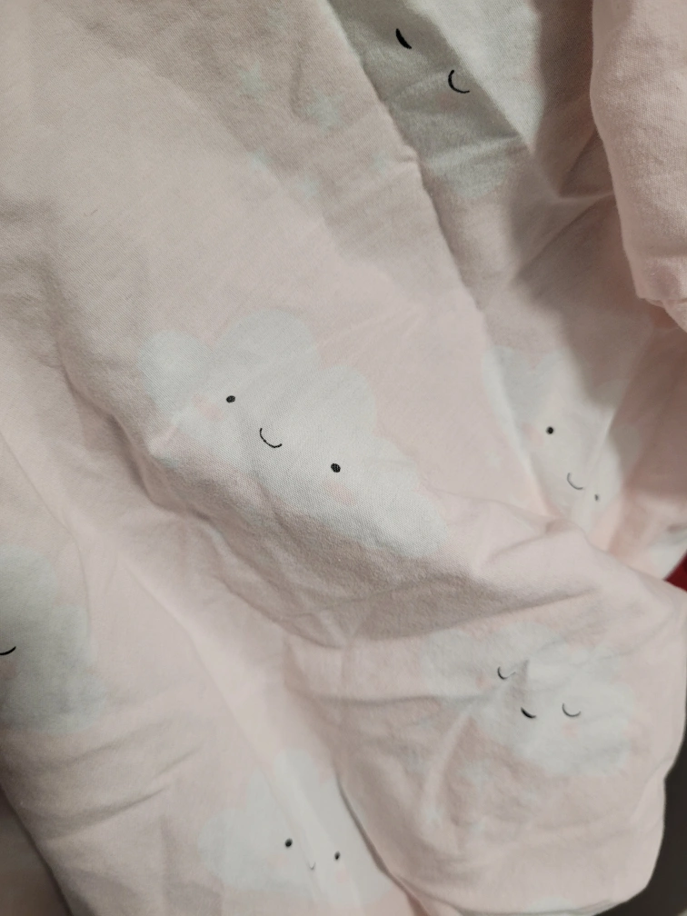 Adorable pink crib sheet. Features a repeating pattern of smiling clouds. Soft and gentle material. Perfect for a nursery.
