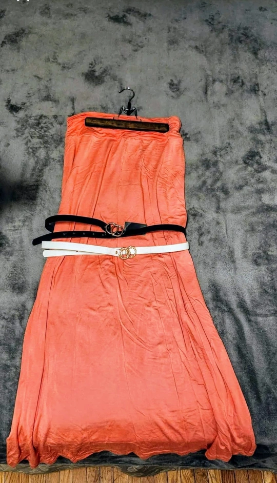 Coral orange maxi skirt. Size large. Made in the USA. 95% Rayon, 5% Spandex. Machine wash cold. Gently cycle. Only wash with like colours. Do not use chlorine bleach. Lay flat to dry. Cool iron if needed.