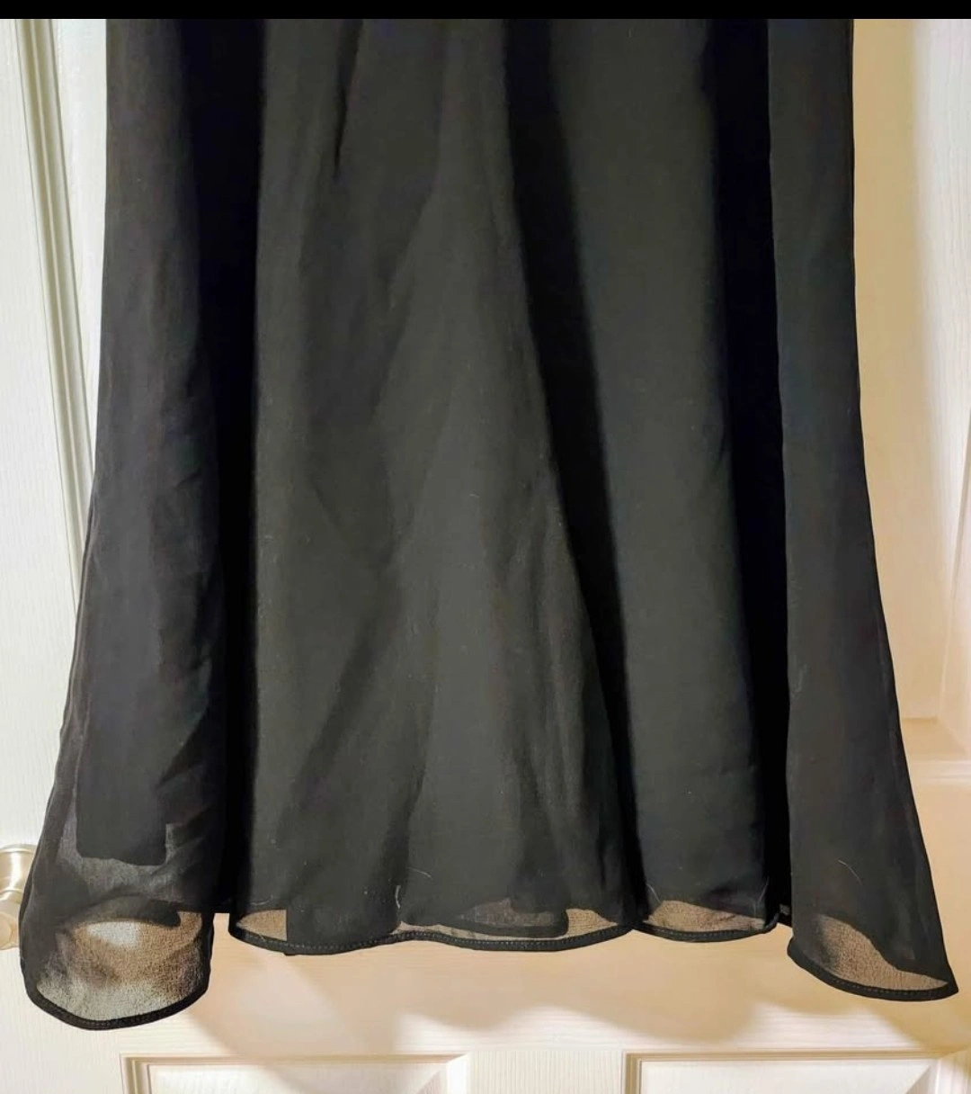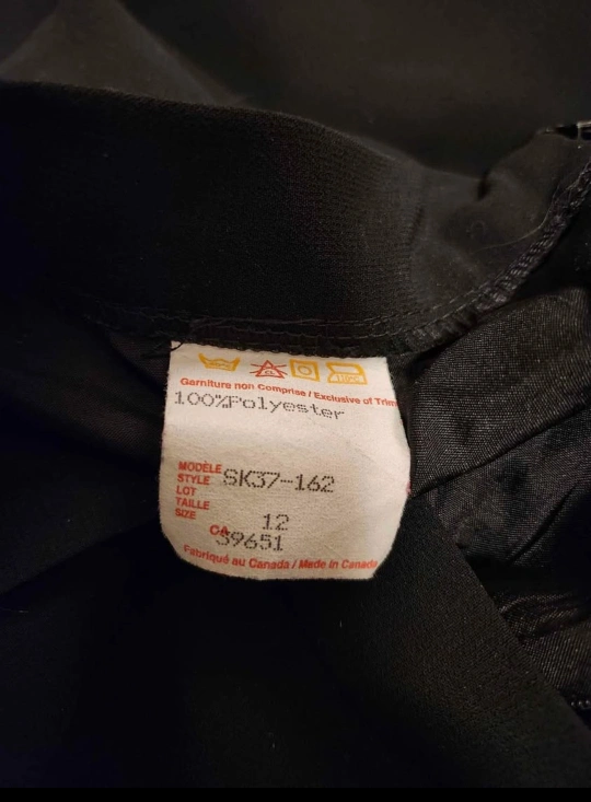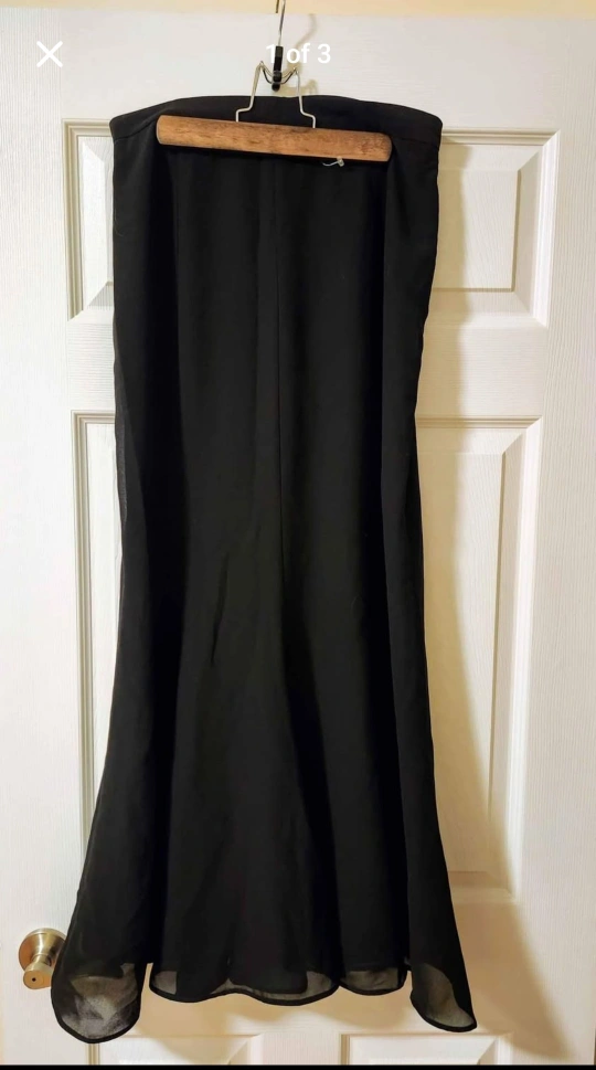 Elegant black formal skirt. Floor-length, fitted waist, slight flare at the bottom. Sheer overlay at the hem. 100% polyester. Made in Canada.