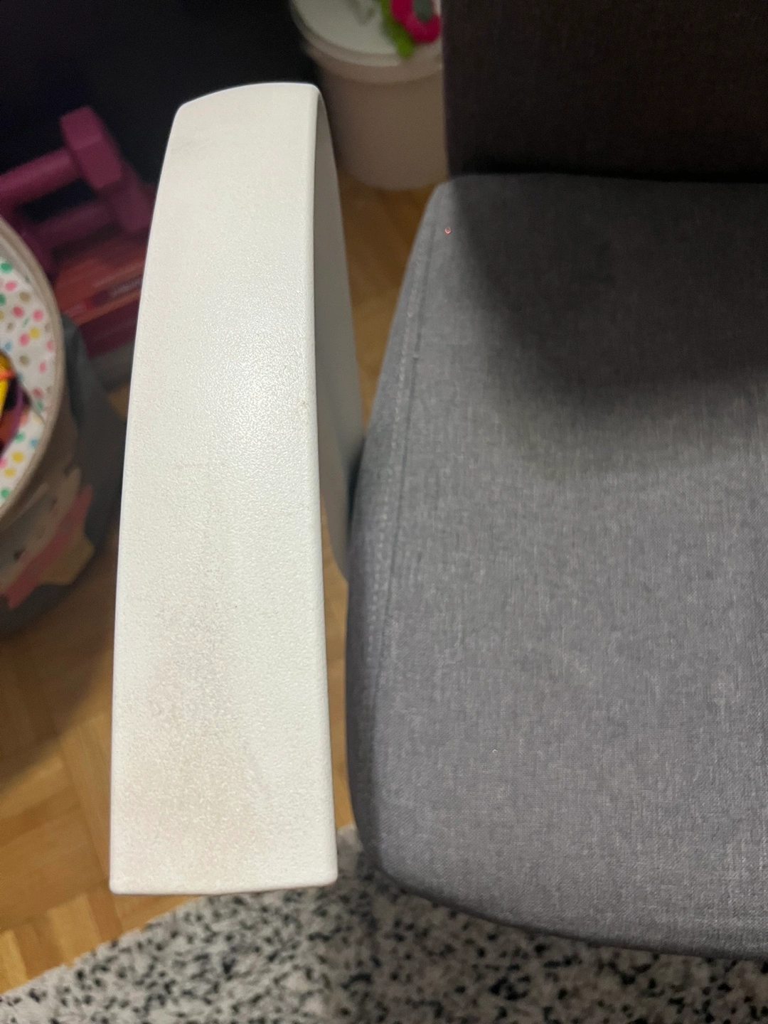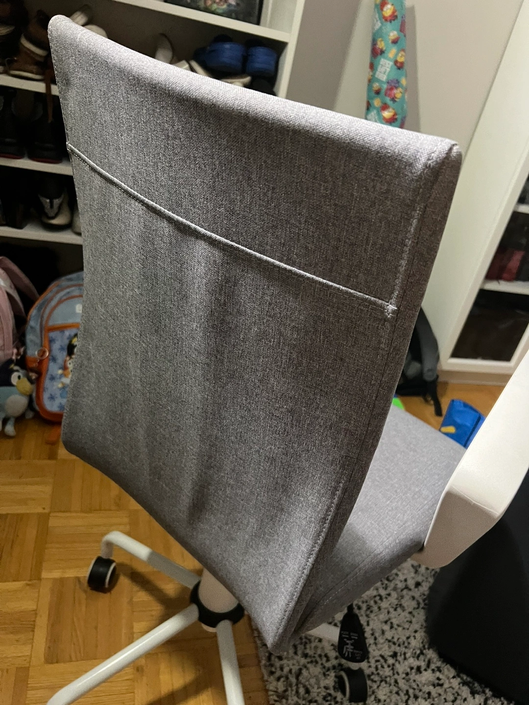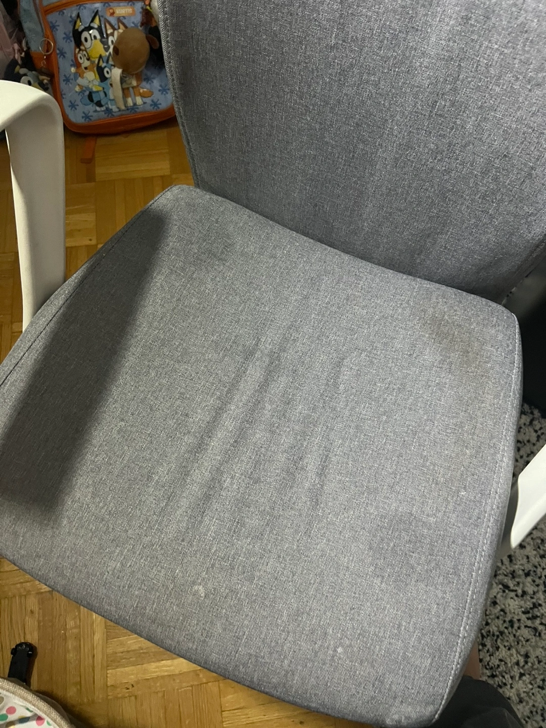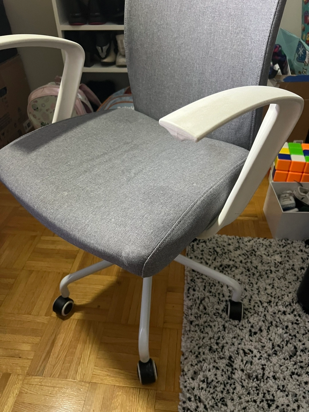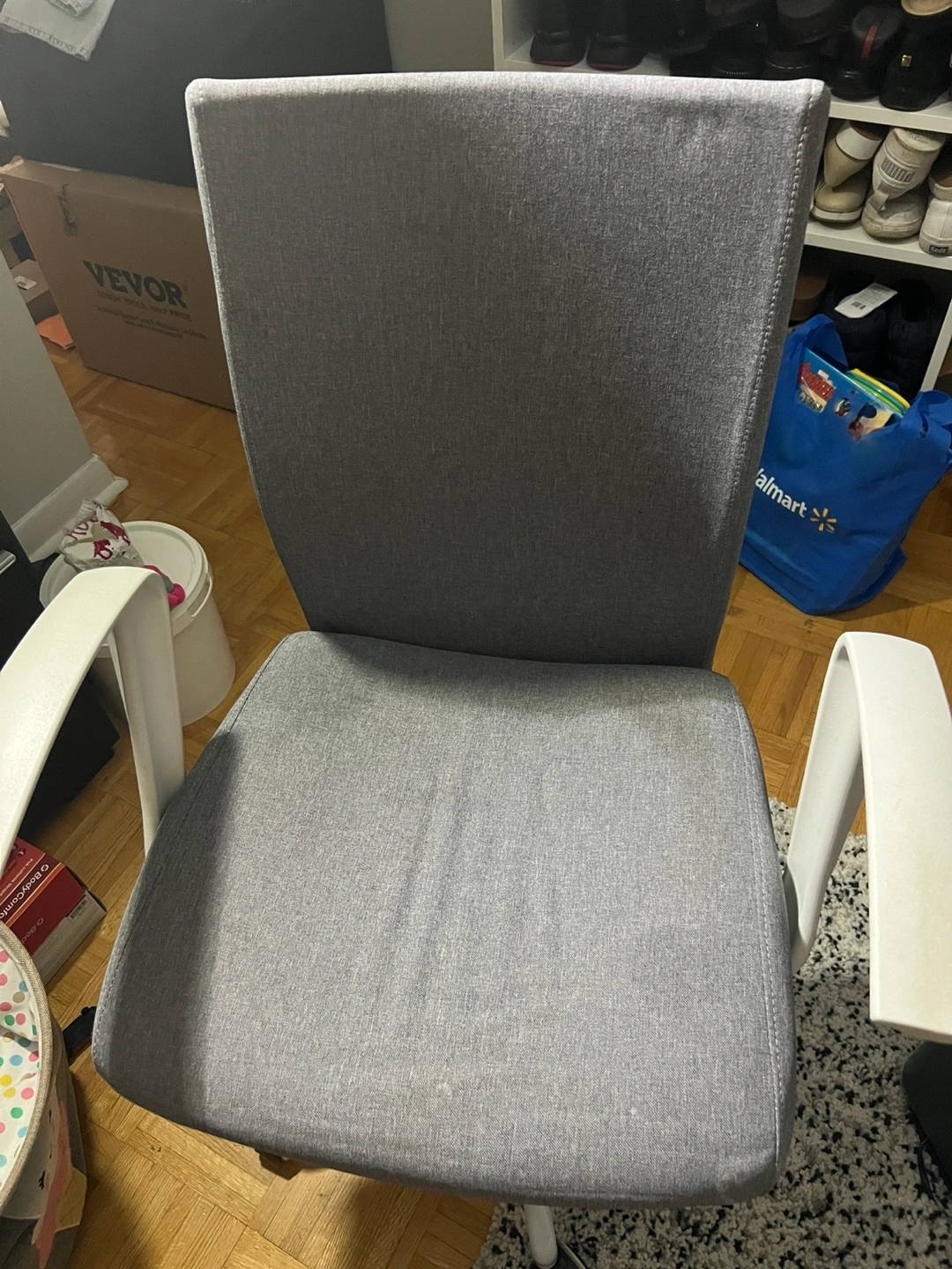 Comfortable grey fabric office chair. Features white plastic armrests and a swivel base with casters. Shows minor wear No rips or any damage But doesn’t go up and down Some unnoticeable stains (please see photos) Located near Mt. Pleasant and Eglinton Ave East Pick up only