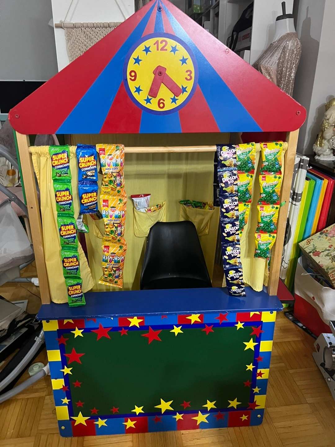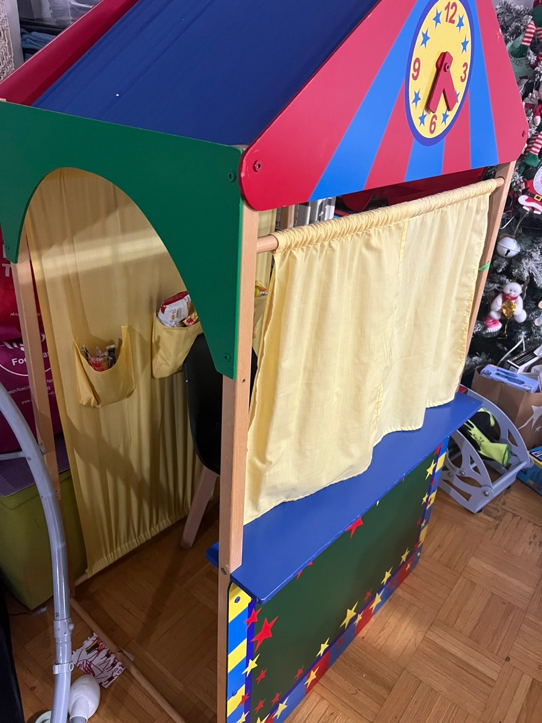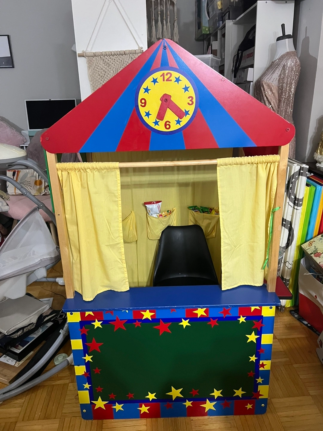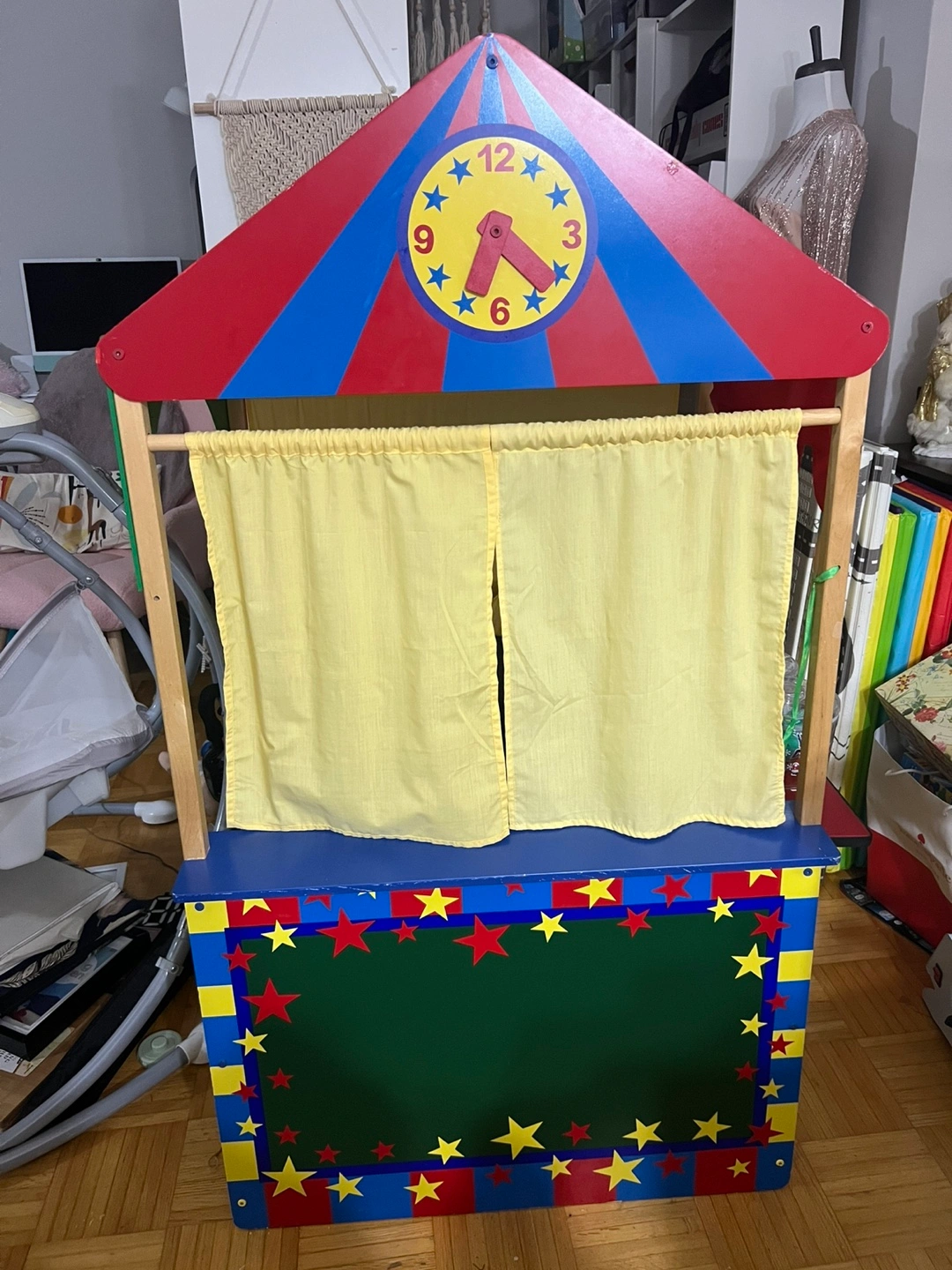 Adorable wooden puppet theatre. Features a colourful circus design, yellow curtains, and a chalkboard counter. Perfect for imaginative play. Some minor wear and tear. In good condition My kids used this as their pretend store as well as puppet theatre Located near Mt. Pleasant and Eglinton Ave East Pick up only