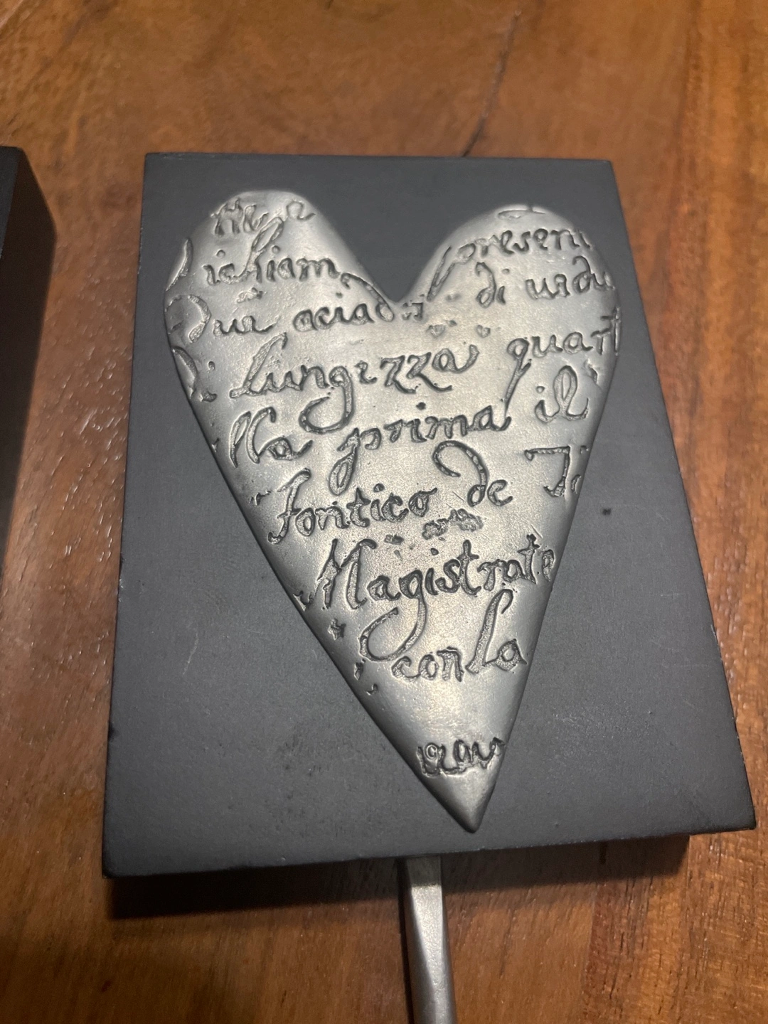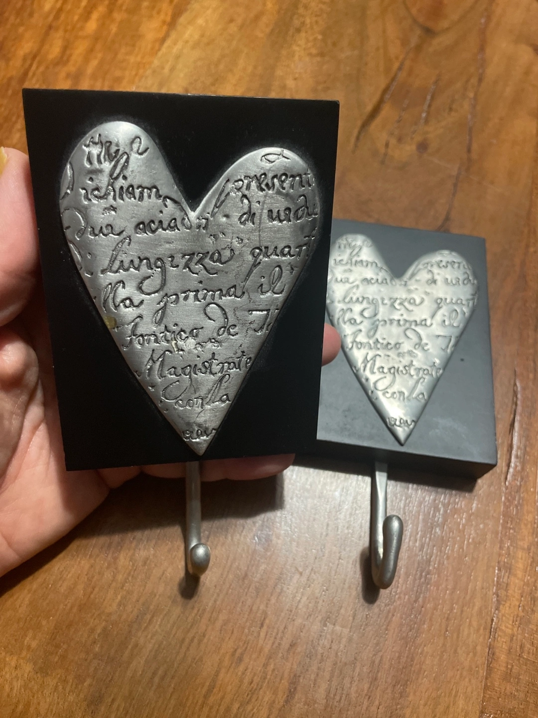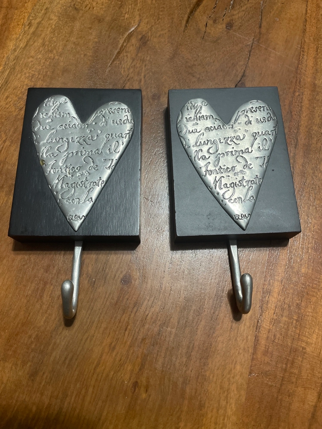 Set of two decorative wall hooks. Features a heart-shaped design with engraved text. Dark wood base and silver metal accents. Great for hanging jewellery or keys. Made in Canada