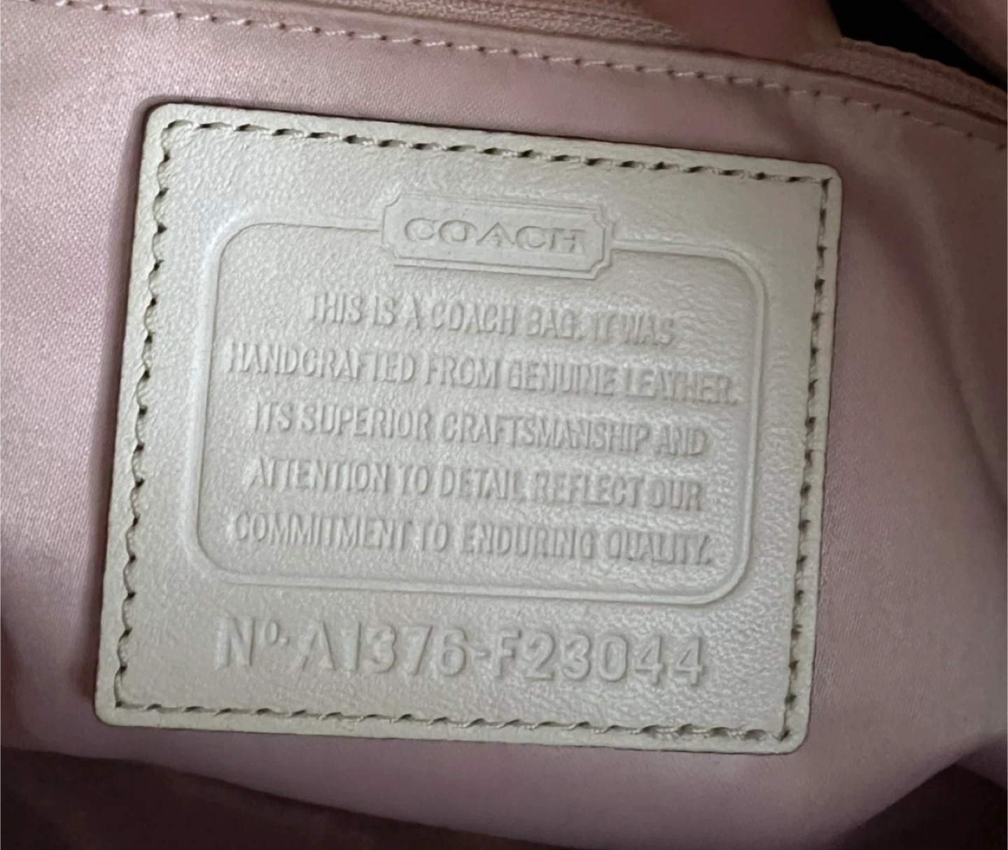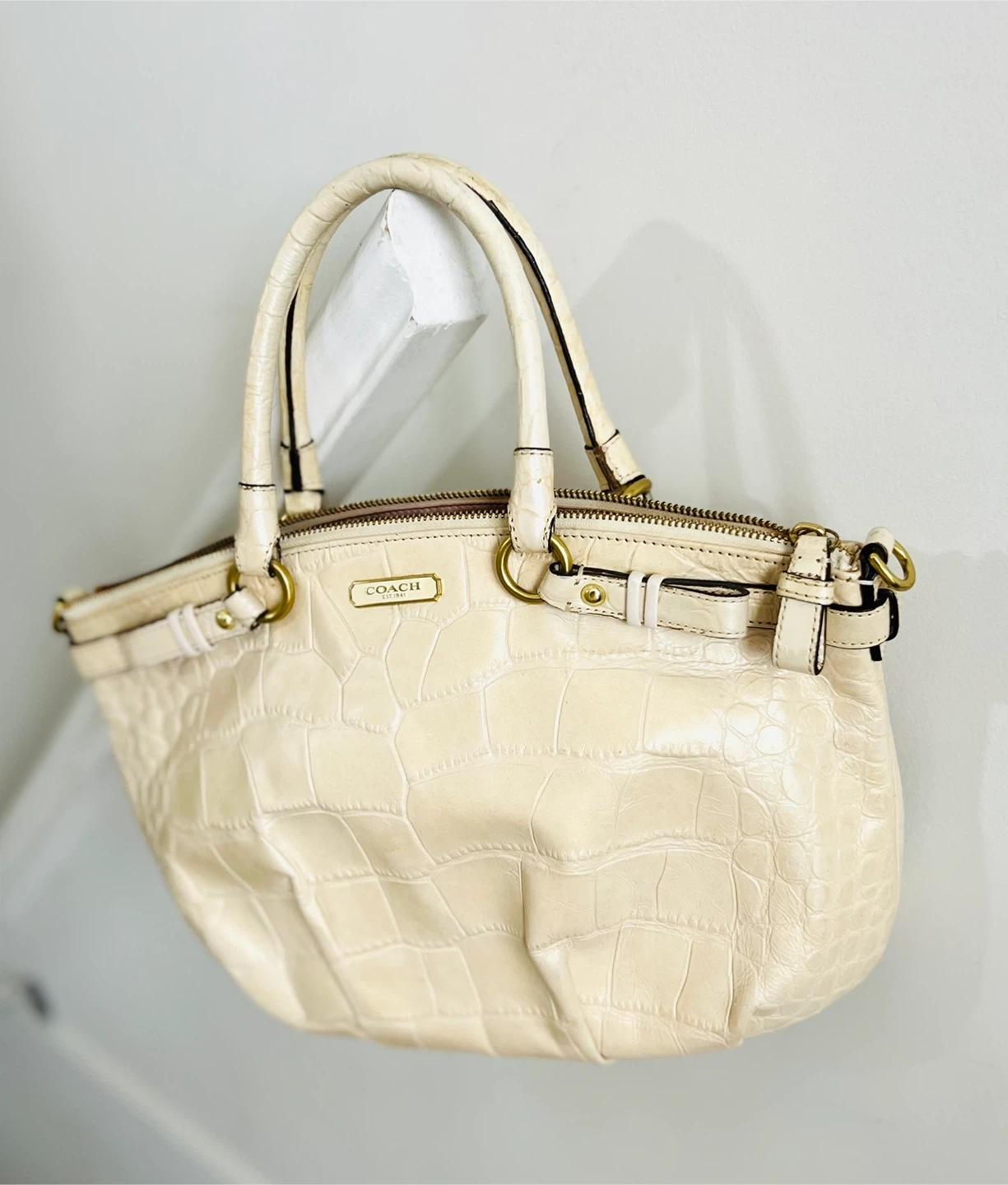 Rare find Pre-owned Coach handbag. Cream coloured leather with crocodile embossing. Top zip closure. Double handles with some scratch on it. Interior is clean and no mark. Model number F23044.
