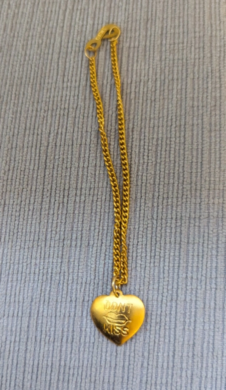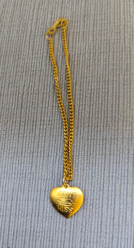 Cute gold-toned bracelet. Features a heart-shaped charm with 'Don't Kiss' engraved. Delicate chain. Perfect for layering.