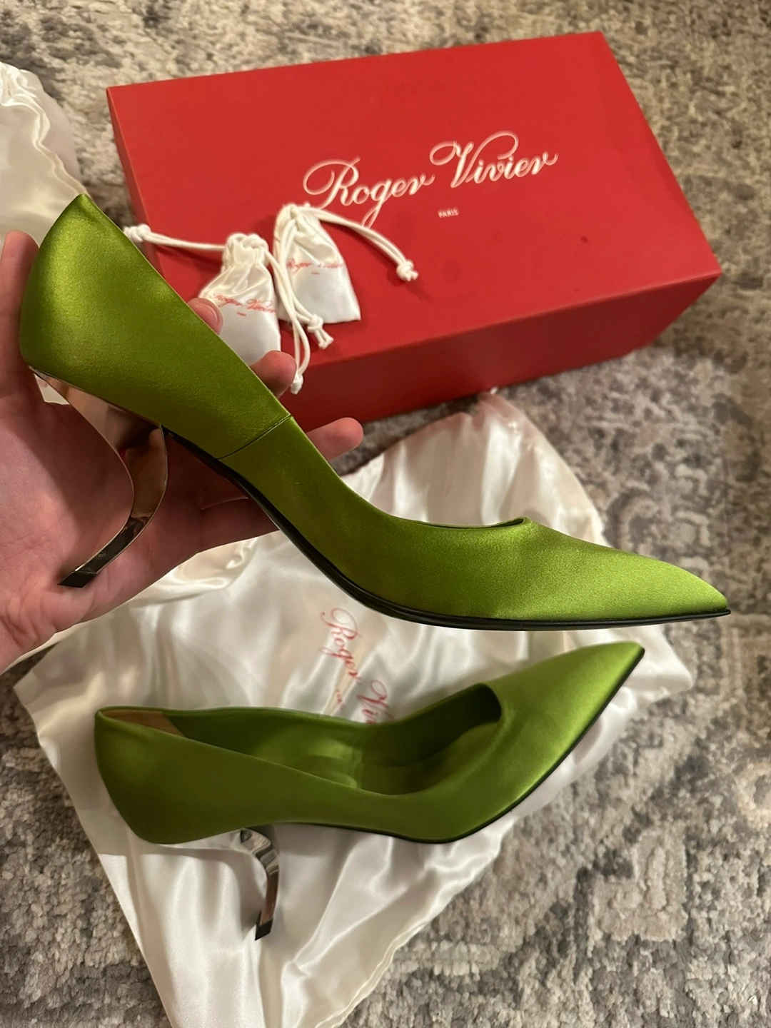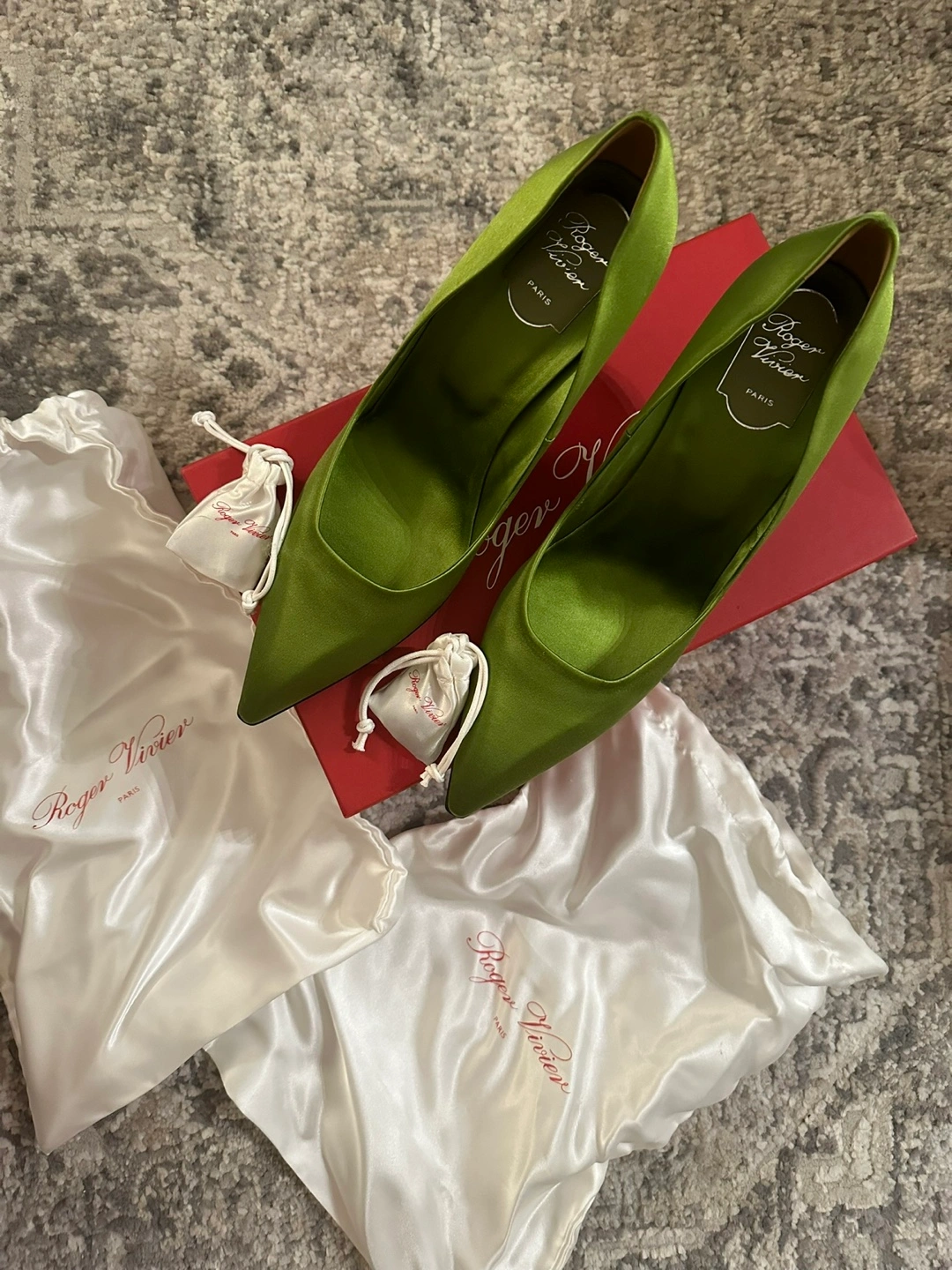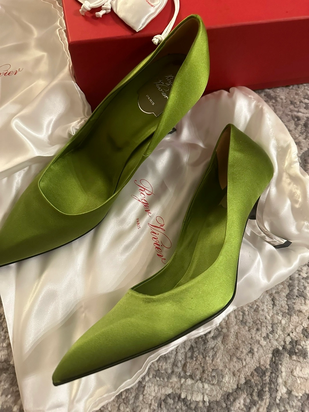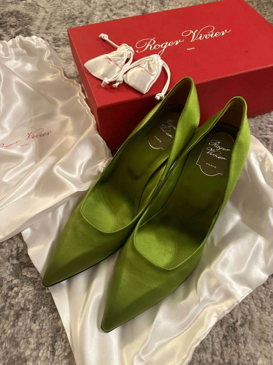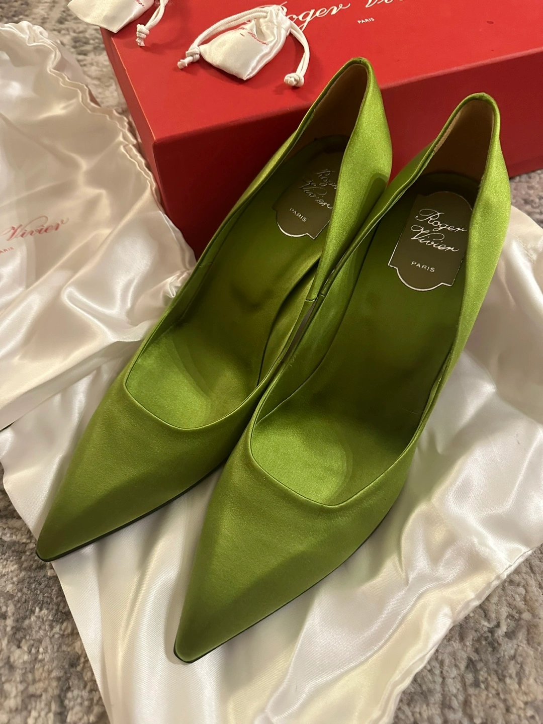 Authentic Roger Vivier Silk Green Pumps 39.5/40 Authentic Roger Vivier Silk Green Pumps Heel height 7.5 cm Size 40 Size 10 US Brand new comes with box, dust bags and extra heels