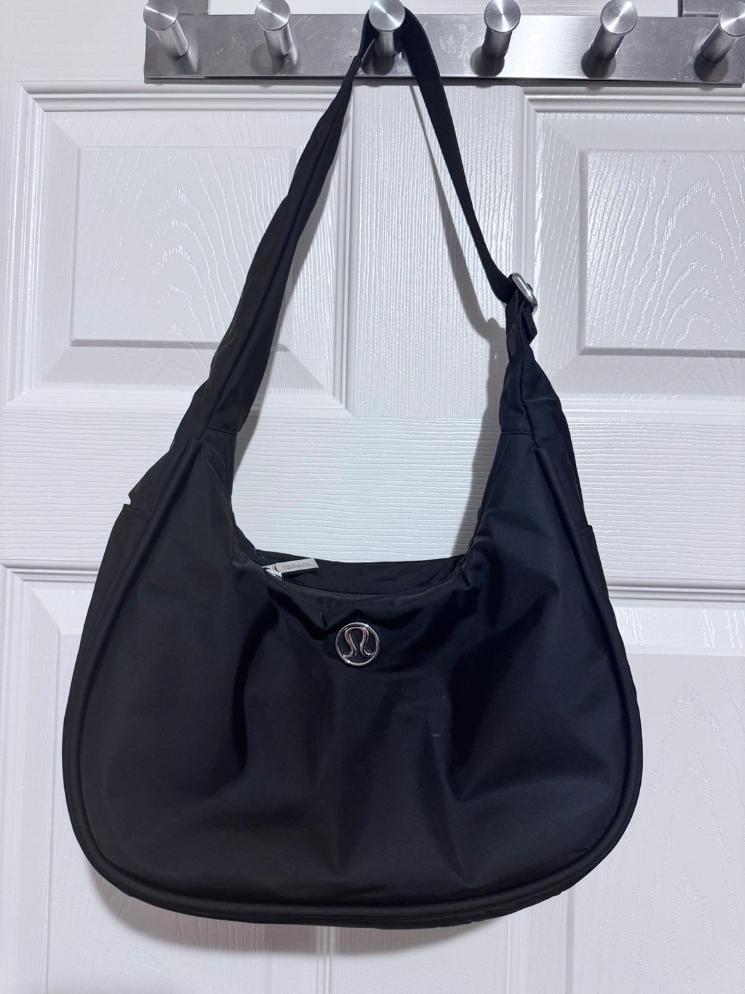 Black nylon shoulder bag. Great for everyday use or the gym. Sold out in Canada Ther is a bit of stain but not much noticeable