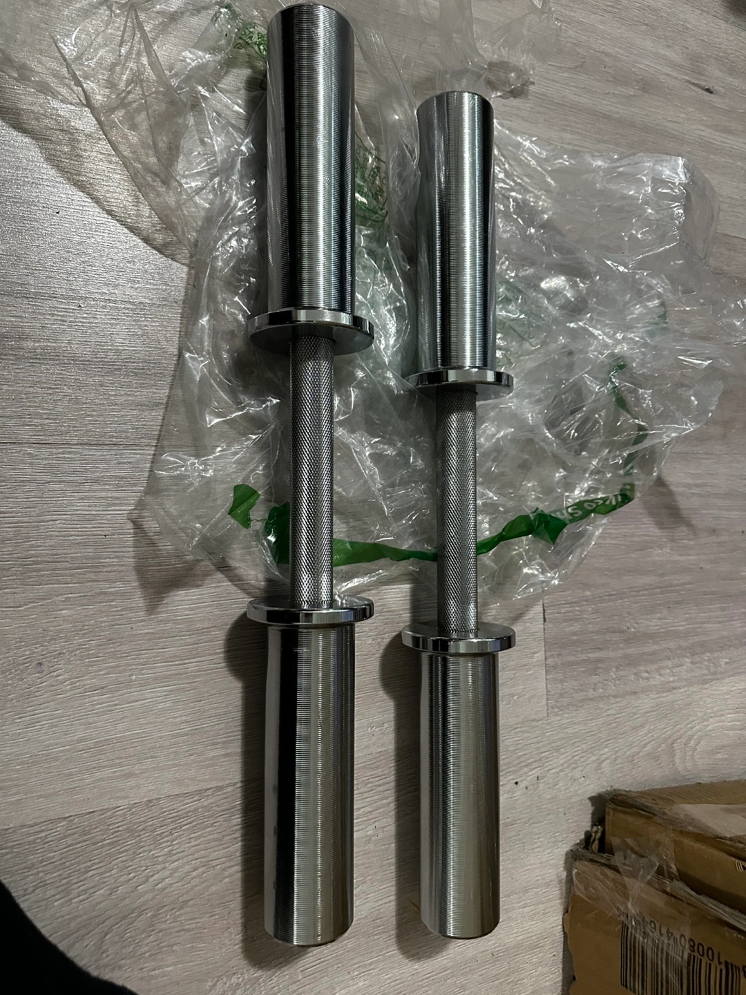 Chrome-plated steel construction. Knurled grip for secure hold. Suitable for standard Olympic weight plates. New, unused.
