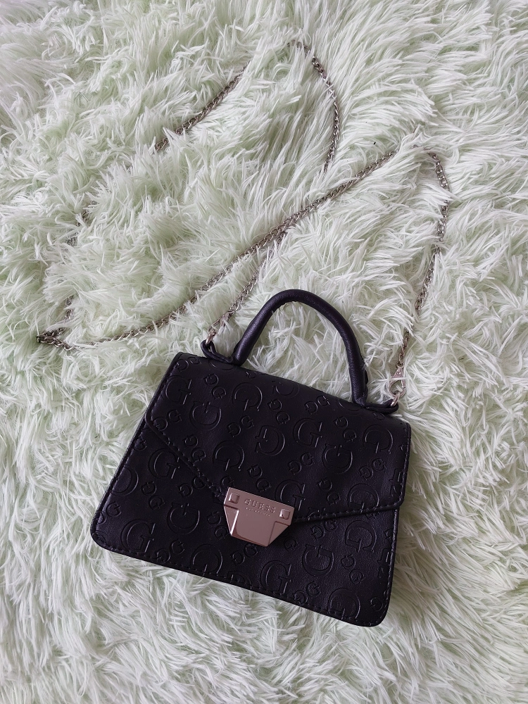 Small black satchel. Features a silver chain strap and top handle. Embossed Guess logo. Perfect for everyday use.