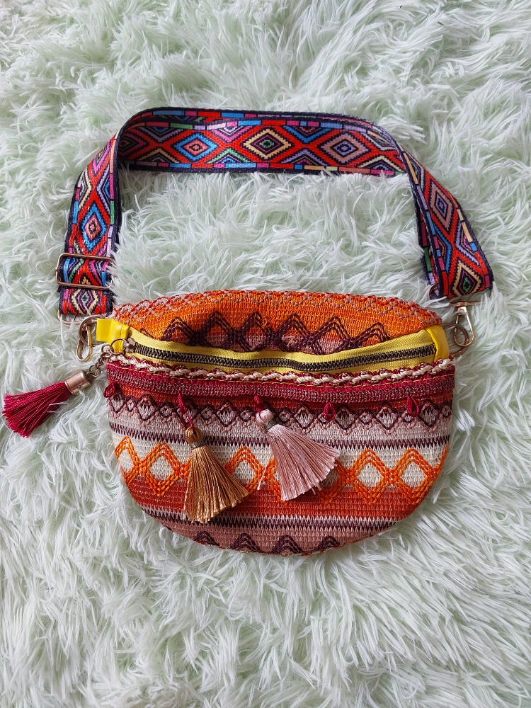 Unique woven fabric. Bright orange, red, and beige tones. Features colourful tassels and a patterned adjustable strap. Small zipper closure.