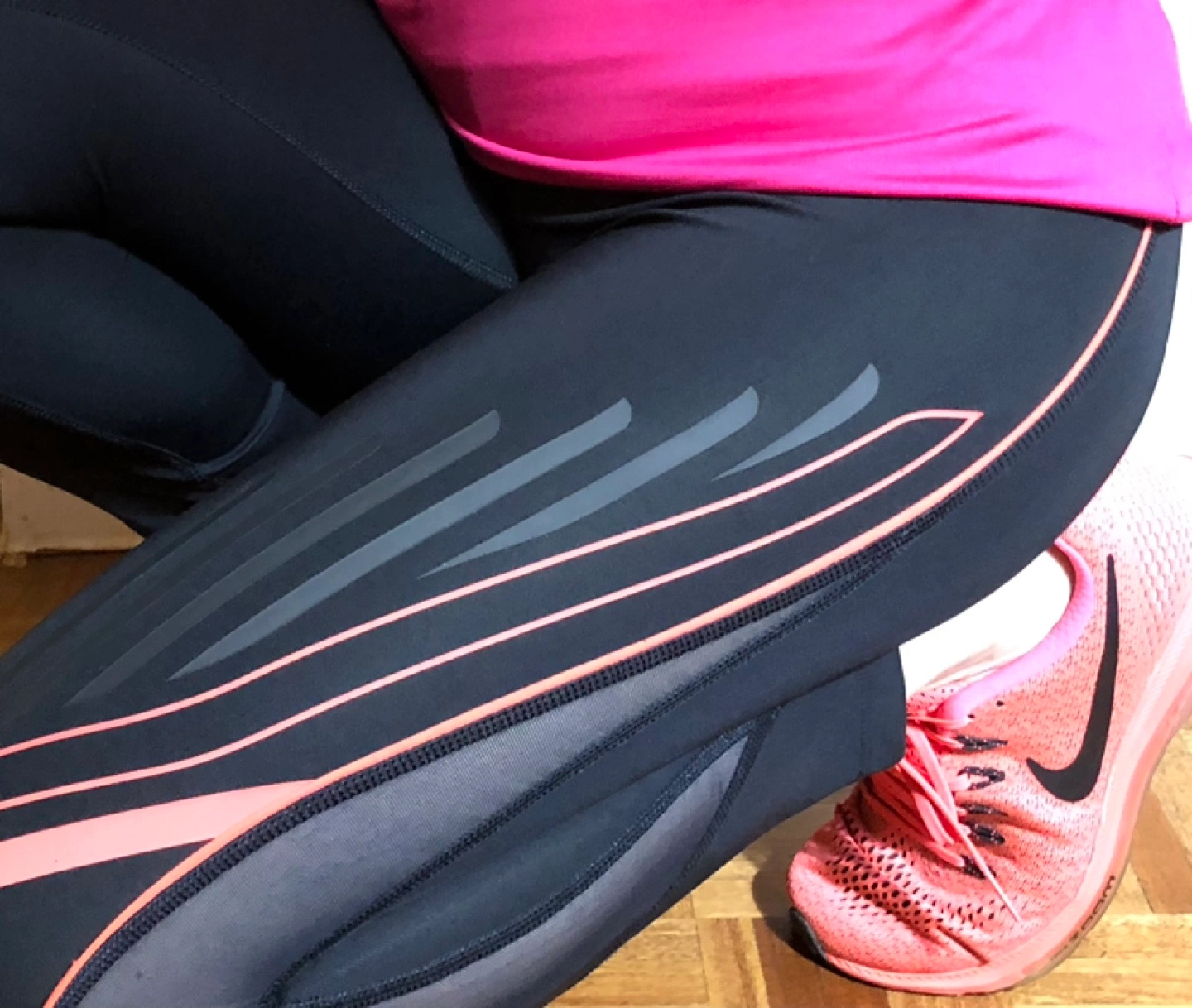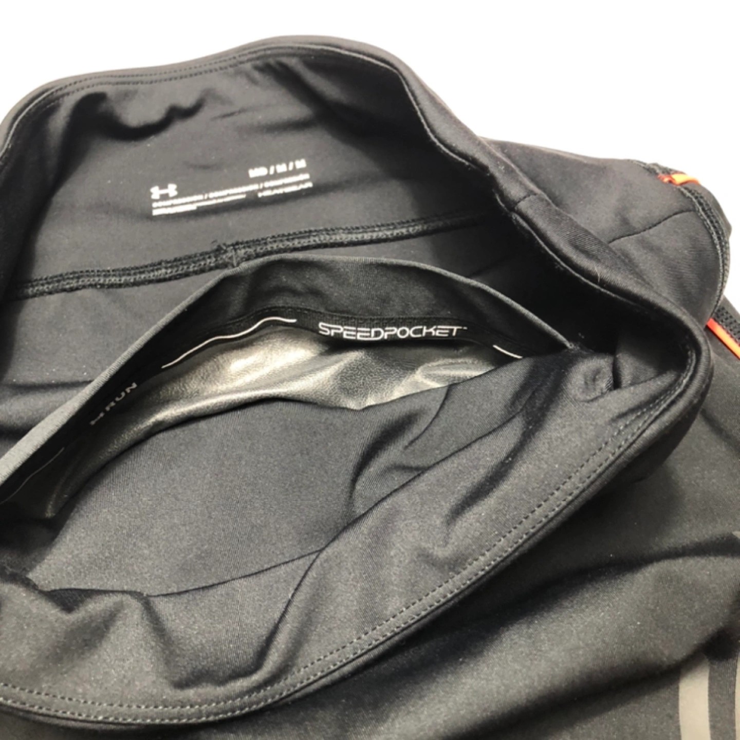 Signature Under Armour high performance ankle length running leggings; black with coral accents. Mesh side panels, non slip high waistband with a hidden interior pocket. Sweat-wicking fast drying fabric with 4-way stretch offers comfortable compression fit. Size medium. Great for workouts or running errands.