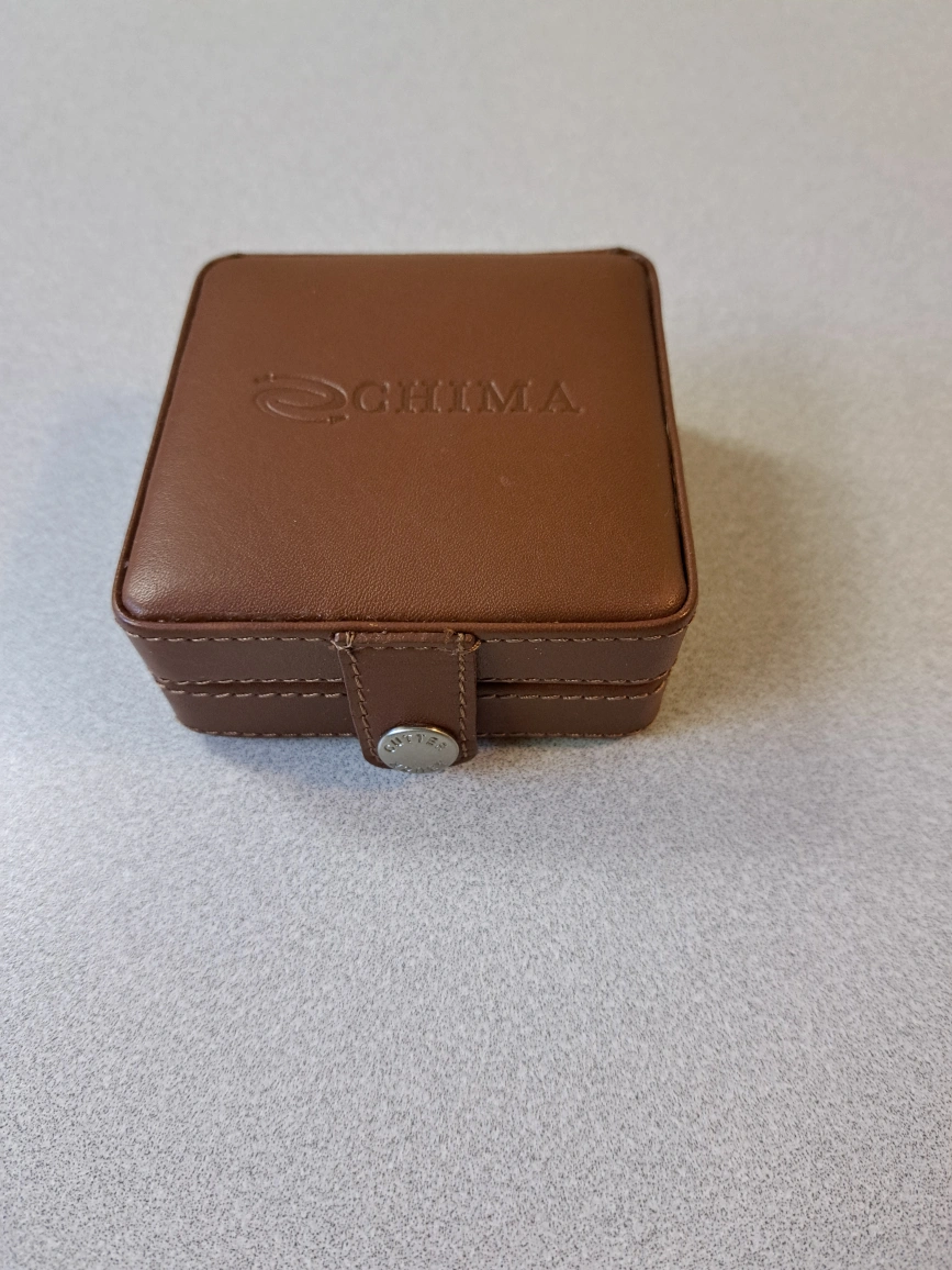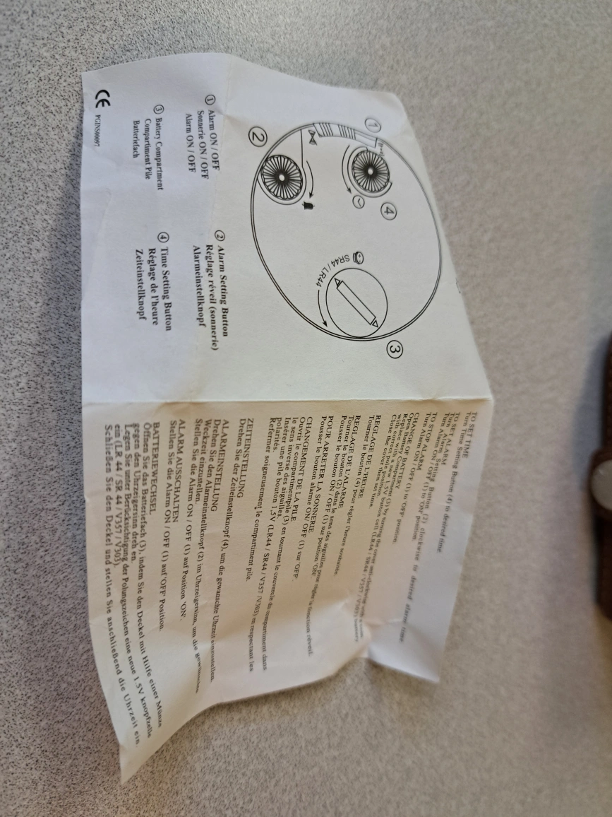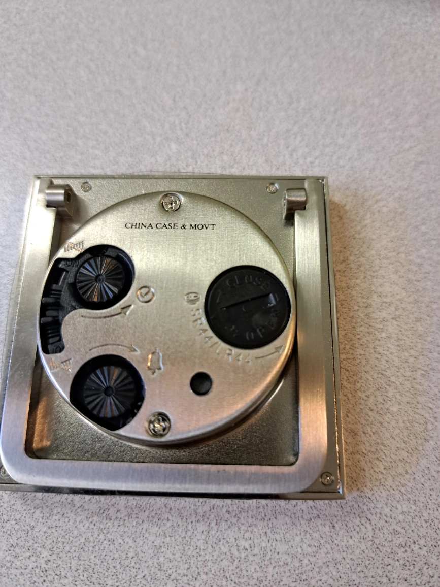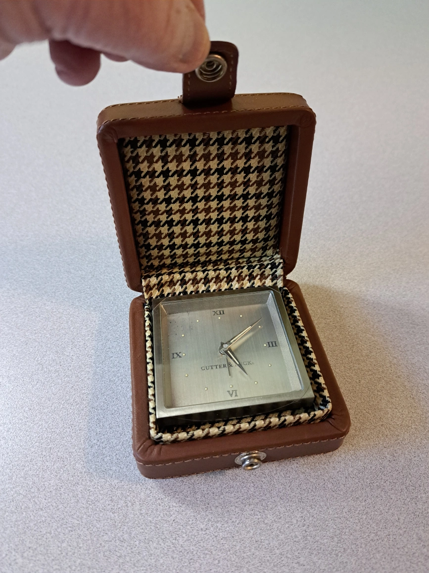 Square alarm clock. Metal face. Brown leather carrying case. Includes instructions. Small, portable. Runs off coin battery. Perfect for low tech users.