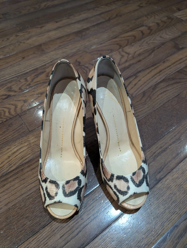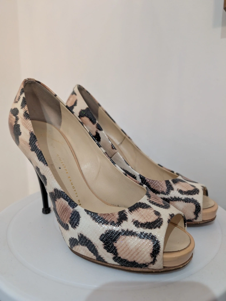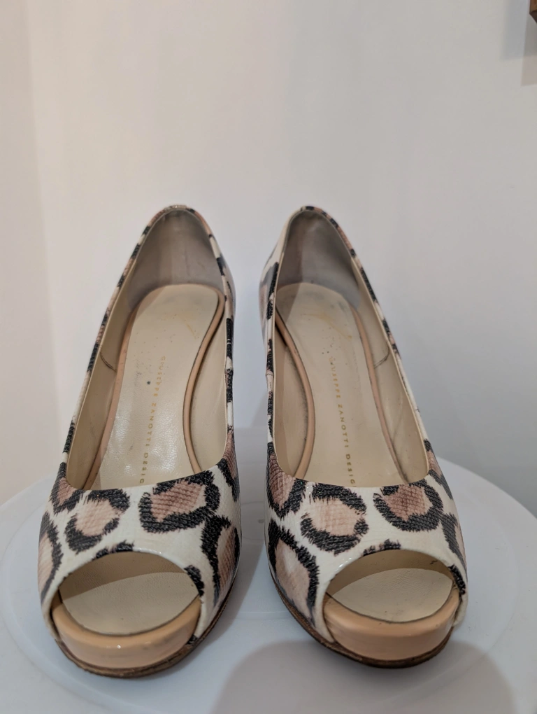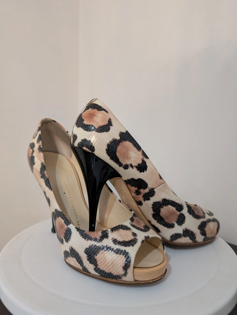 Elegant peep toe heels. Leopard print design. Stiletto heels Giuseppe Zanotti snake/leopard Print Peep Toe 4" Heels Step out in style with these chic leopard print peep toe heels. Perfect for adding a touch of fun & elegance to any outfit. excellent used condition heals have small scuffs near the base anti slip has been added to the toe leather made in Italy size 36.5