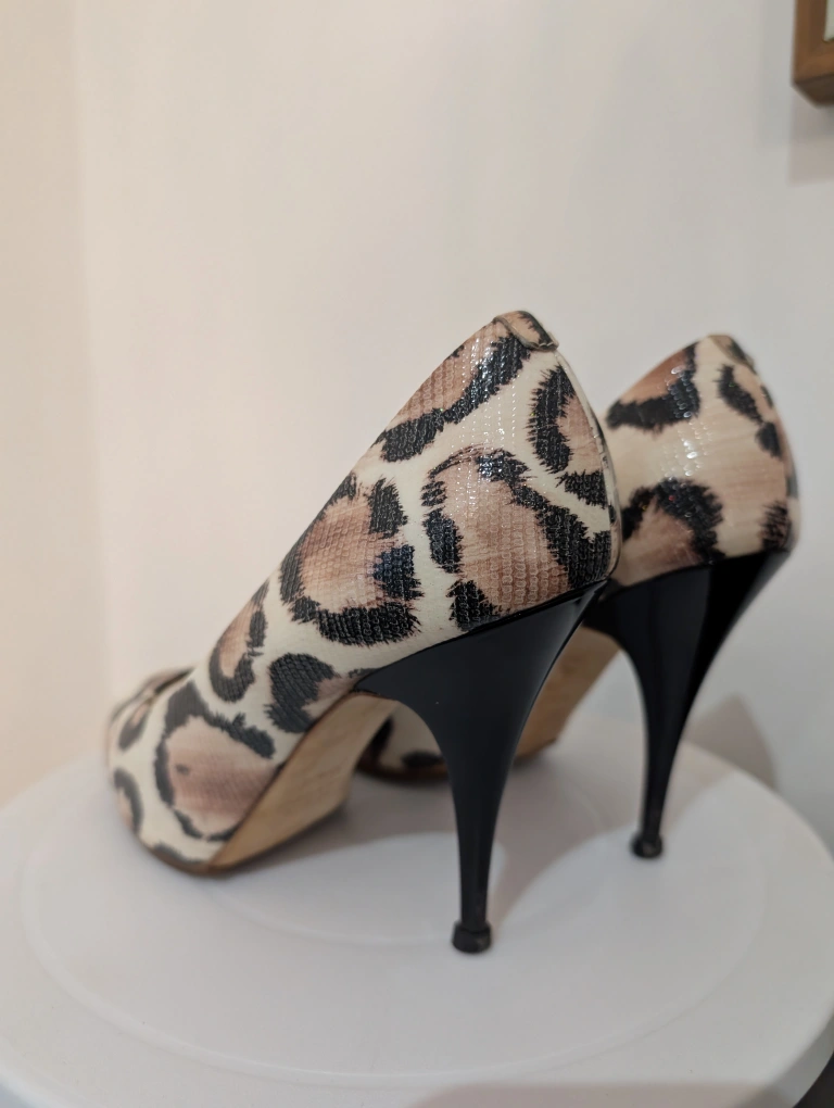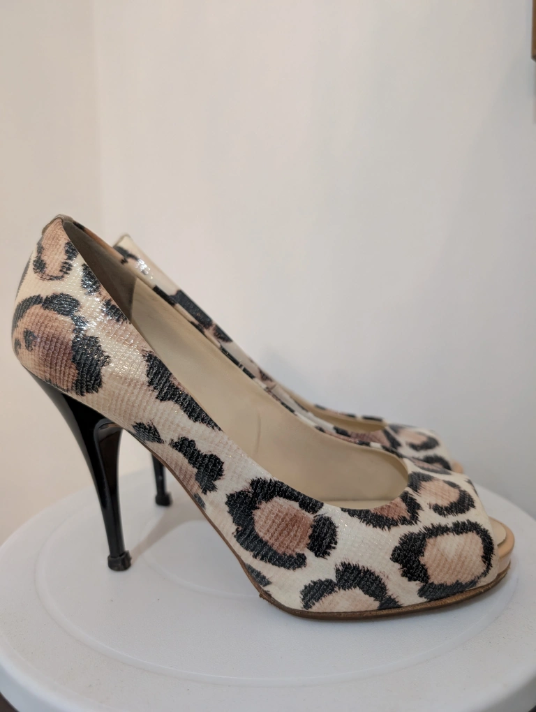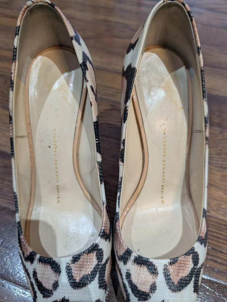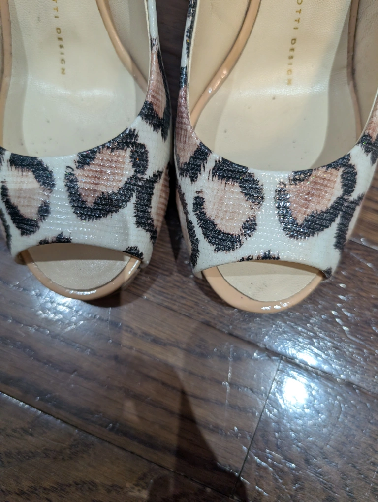 Elegant peep toe heels. Leopard print design. Stiletto heels Giuseppe Zanotti snake/leopard Print Peep Toe 4" Heels Step out in style with these chic leopard print peep toe heels. Perfect for adding a touch of fun & elegance to any outfit. excellent used condition heals have small scuffs near the base anti slip has been added to the toe leather made in Italy size 36.5