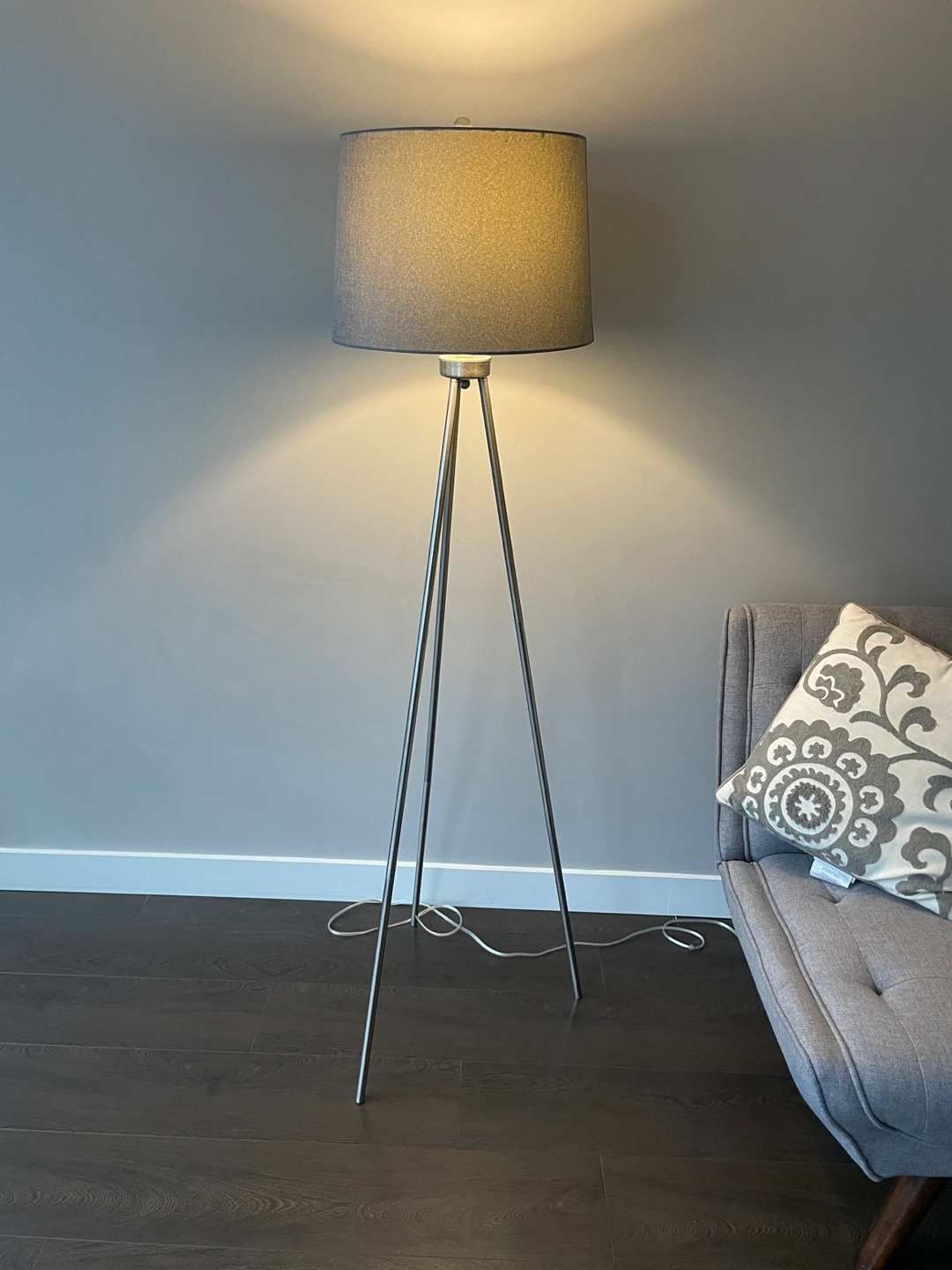 Modern tripod floor lamp. Metal frame, grey fabric lampshade. Excellent for living room or bedroom. Only available for self pick up.