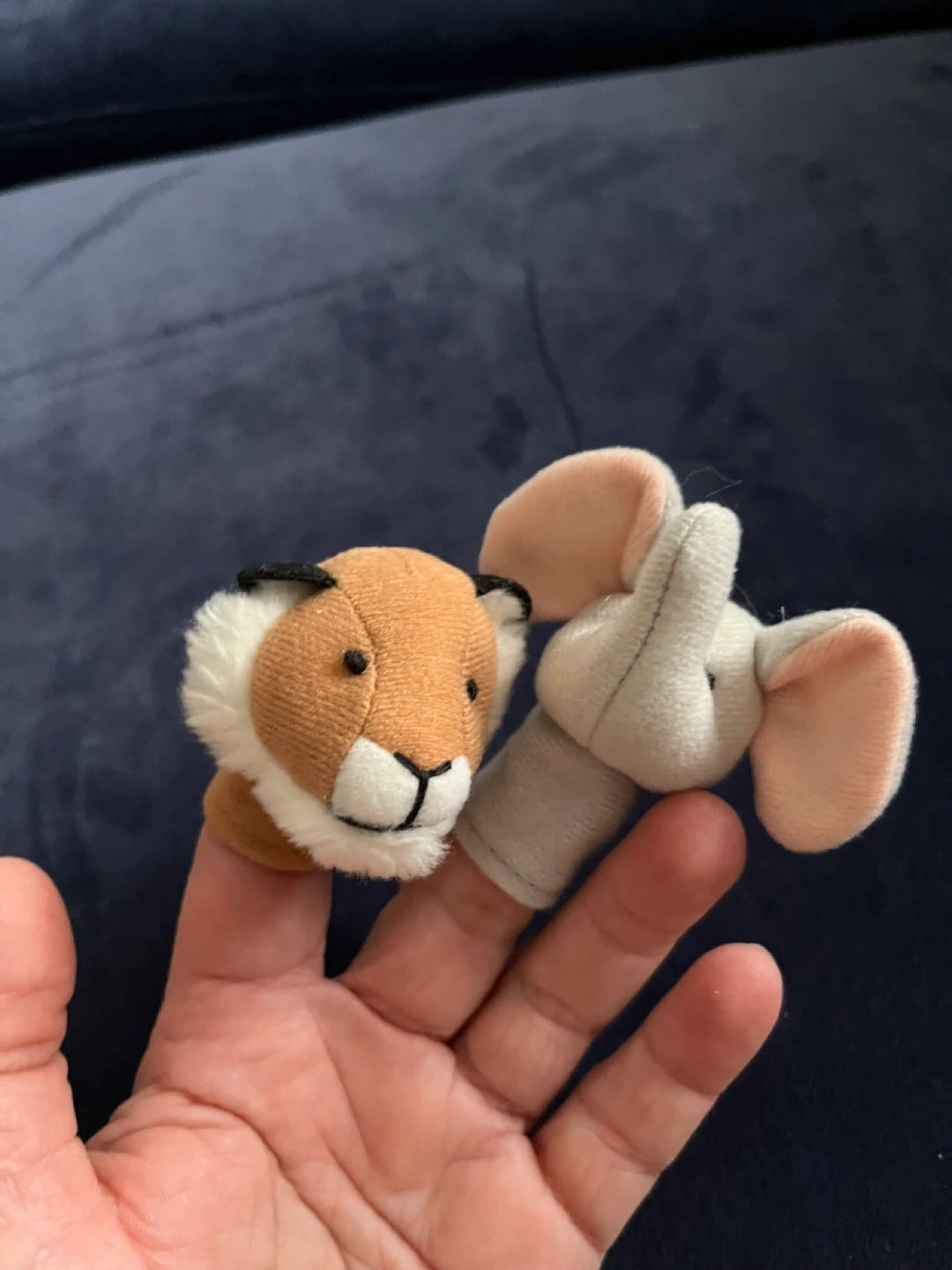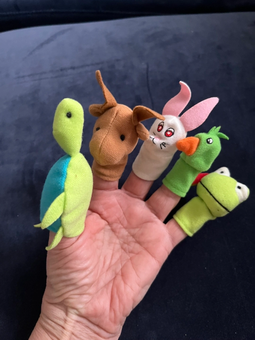 Seven colourful finger puppets. Includes a turtle, deer, rabbit, duck, frog, lion, and elephant. Soft and cuddly, perfect for imaginative play. Gently used. Cash only