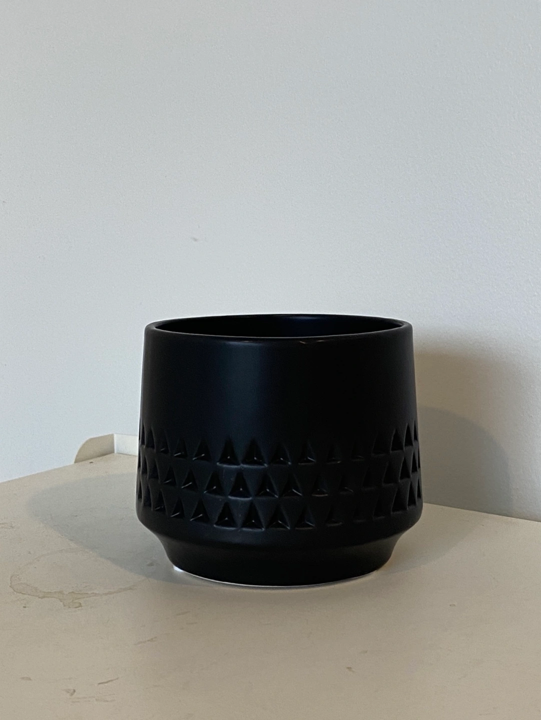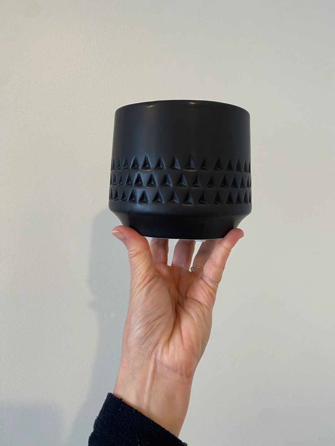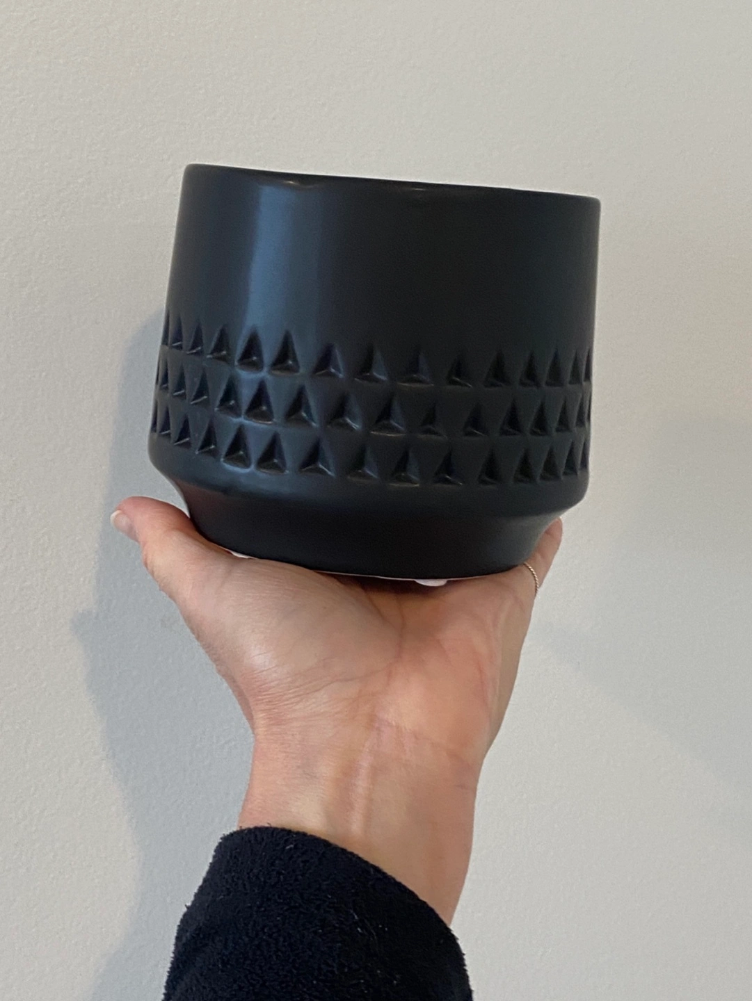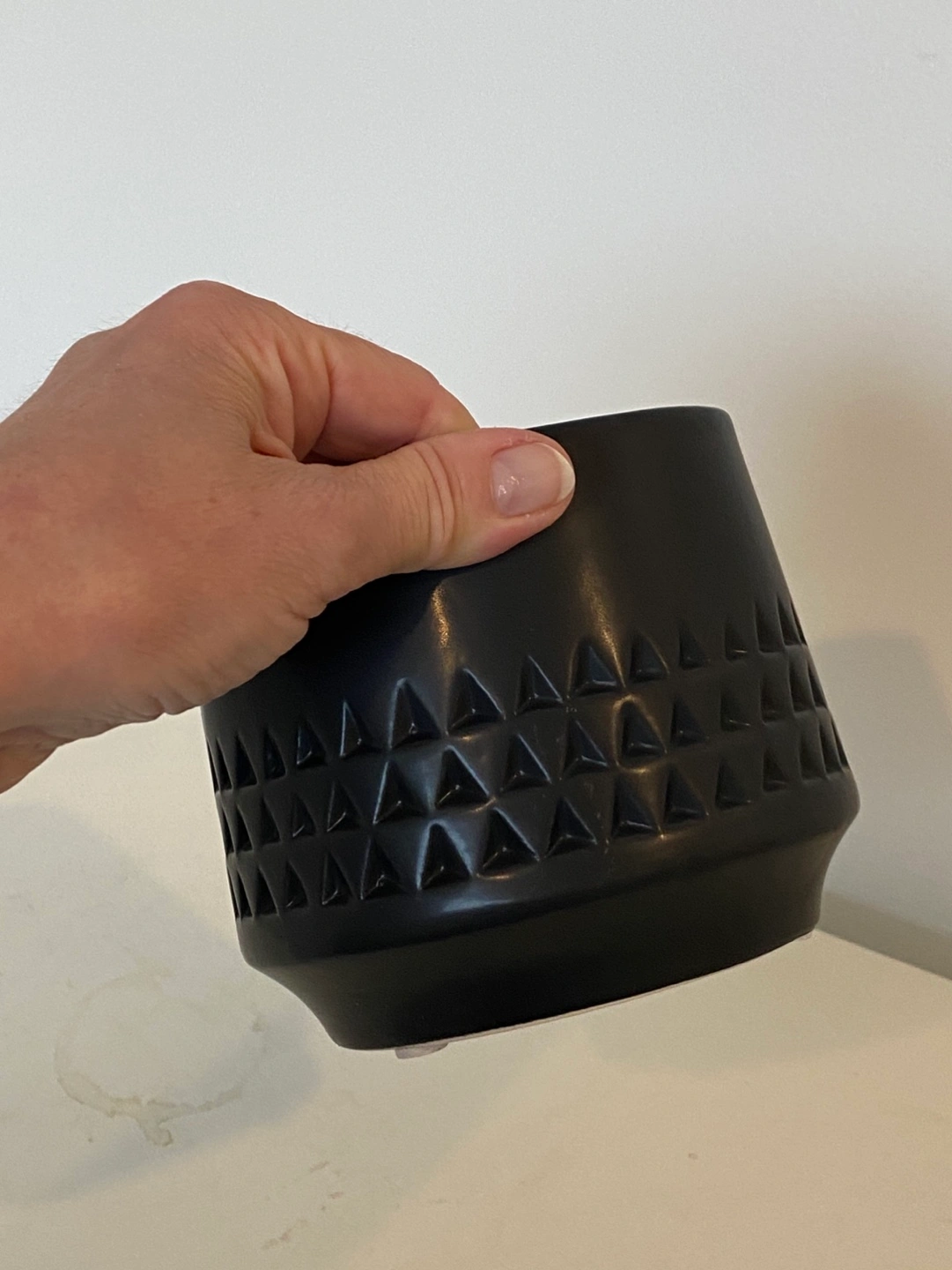 • Small black ceramic planter. • Approximately 4.5”w x 4.5”h • Perfect for small plants or succulents. • Art deco style design. • $5 each 🔔 ONLY 2 LEFT This is less than the wholesale price (so please don’t ask me for a better price). I have 6 available. Pick up ONLY in East End Toronto (Gerrard St East and Carlaw Ave area)
