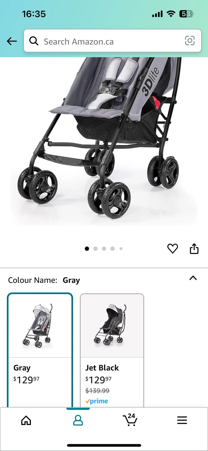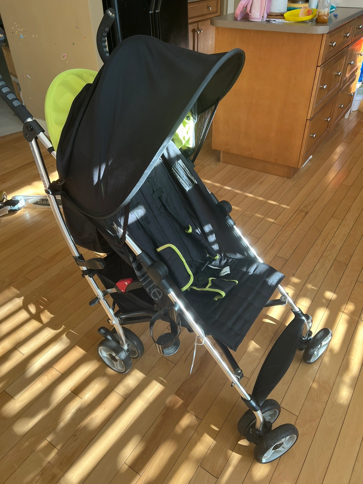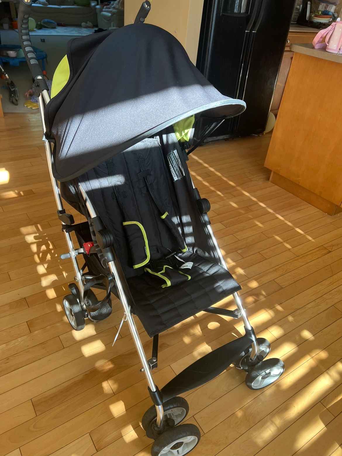 Black stroller with green accents. Includes a sunshade as gift. Light and compact. Folds easily. Great for travel.