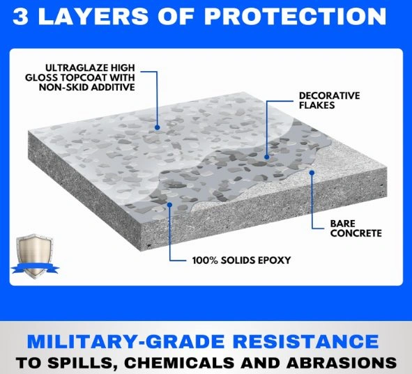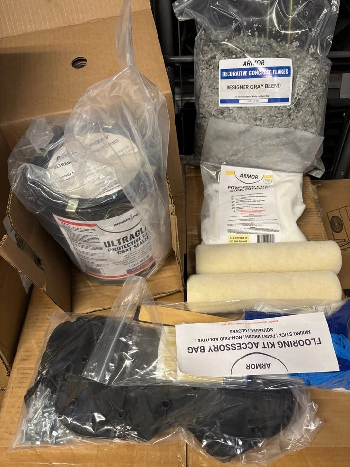 Heavy-Duty Industrial Epoxy Floor Coating Kit Set (Covers 1800 Sq Ft) New in box Pickup in Barrhaven, Mountshannon and Daventry street intersection. 3 complete kits available — covers up to 1,800 sq ft total Perfect for garages, workshops, basements, showrooms Each kit covers approx. 600 sq ft Includes etching solution, medium gray flakes, non-slip additive, roller, and squeegee Military-grade 100% solids epoxy, 10x stronger than steel Resists cracks, peeling, stains, and hot tire pickup 3-layer coating protects against oil, solvents, and chemicals Medium gray flakes provide a textured designer look Optional to add extra flakes for heavier coverage Cures in 24 hours, vehicle ready in 72 hours High gloss finish, no shrinkage, permanent bond to concrete