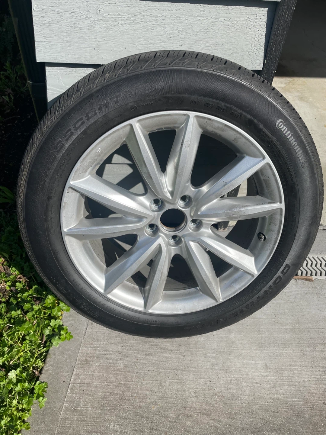 Selling 4 Rims and Continental CrossContact LX25 tire. It's size 235/55R19 and marked with M+S. Great for all seasons!