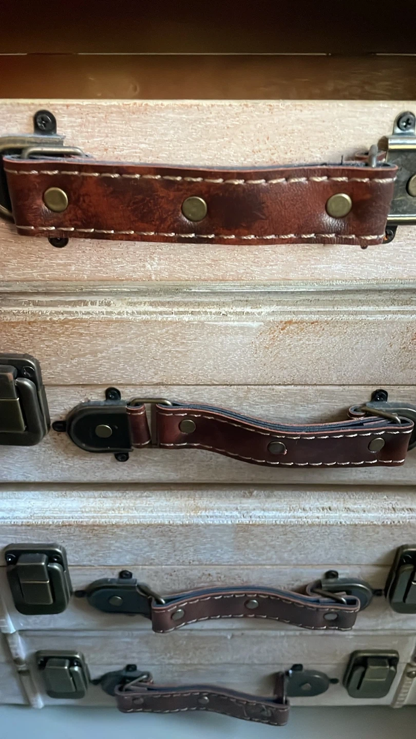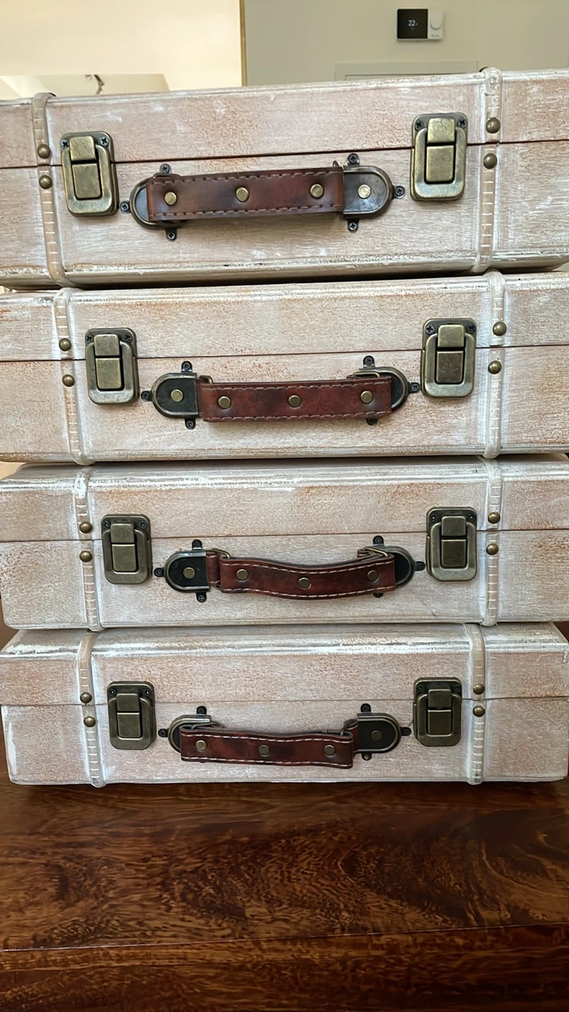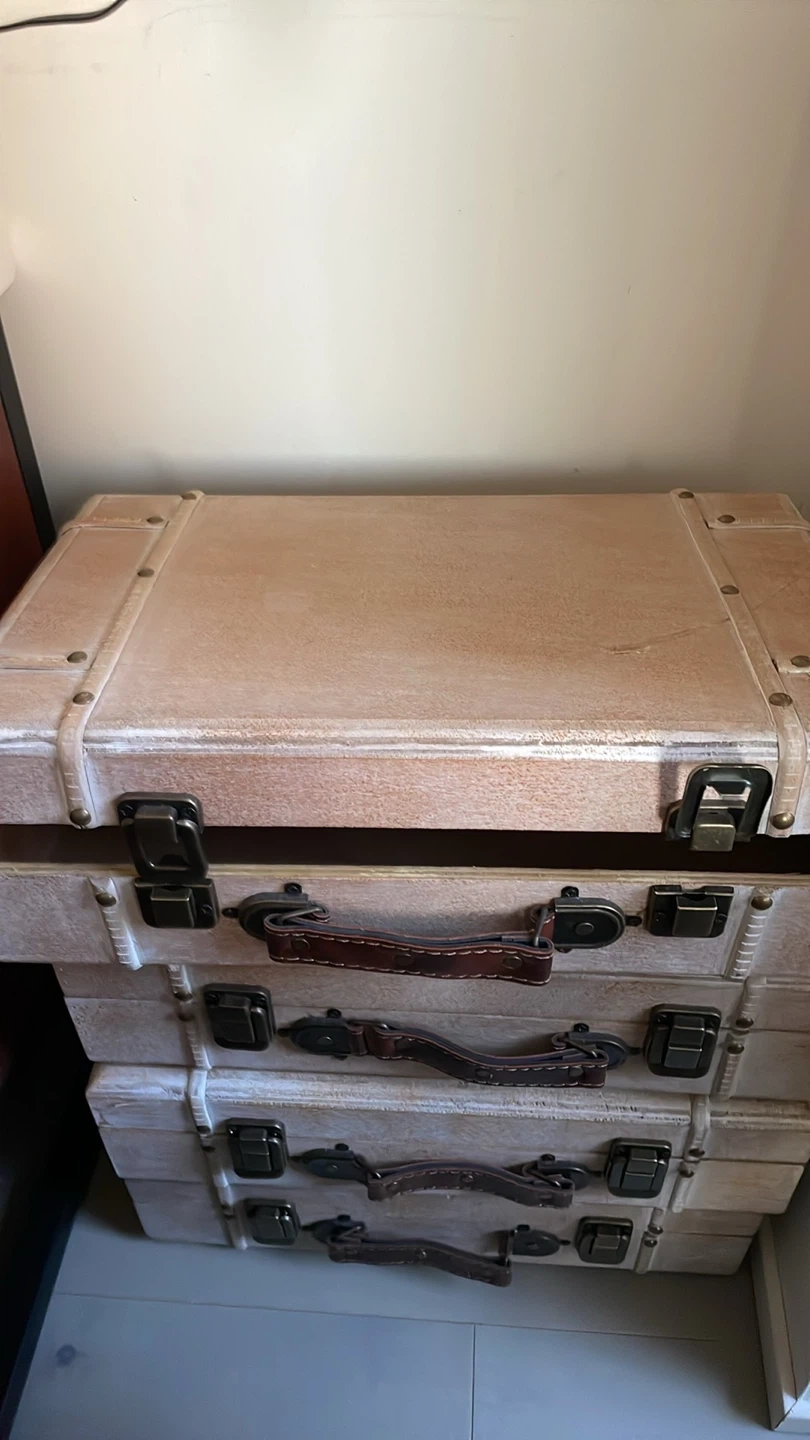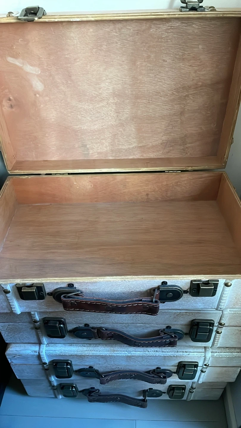 This is a decorative suitcase storage tower. It features four suitcase-style drawers, perfect for adding a vintage touch to your home decor. The tower is made of wood and has a distressed finish, giving it a rustic look. Each drawer has a handle, making it easy to open and close. It's great for storing various items while adding a unique style to your space