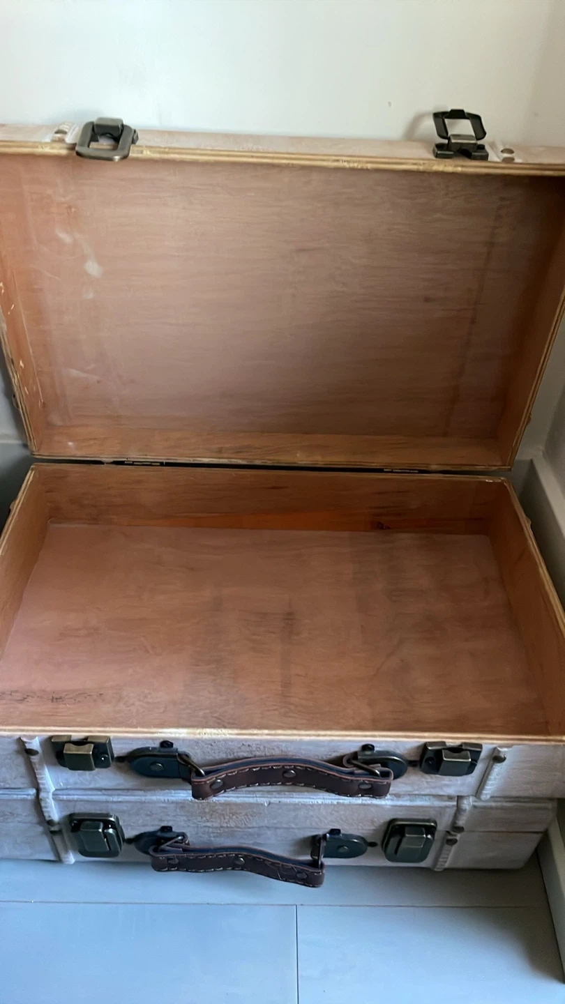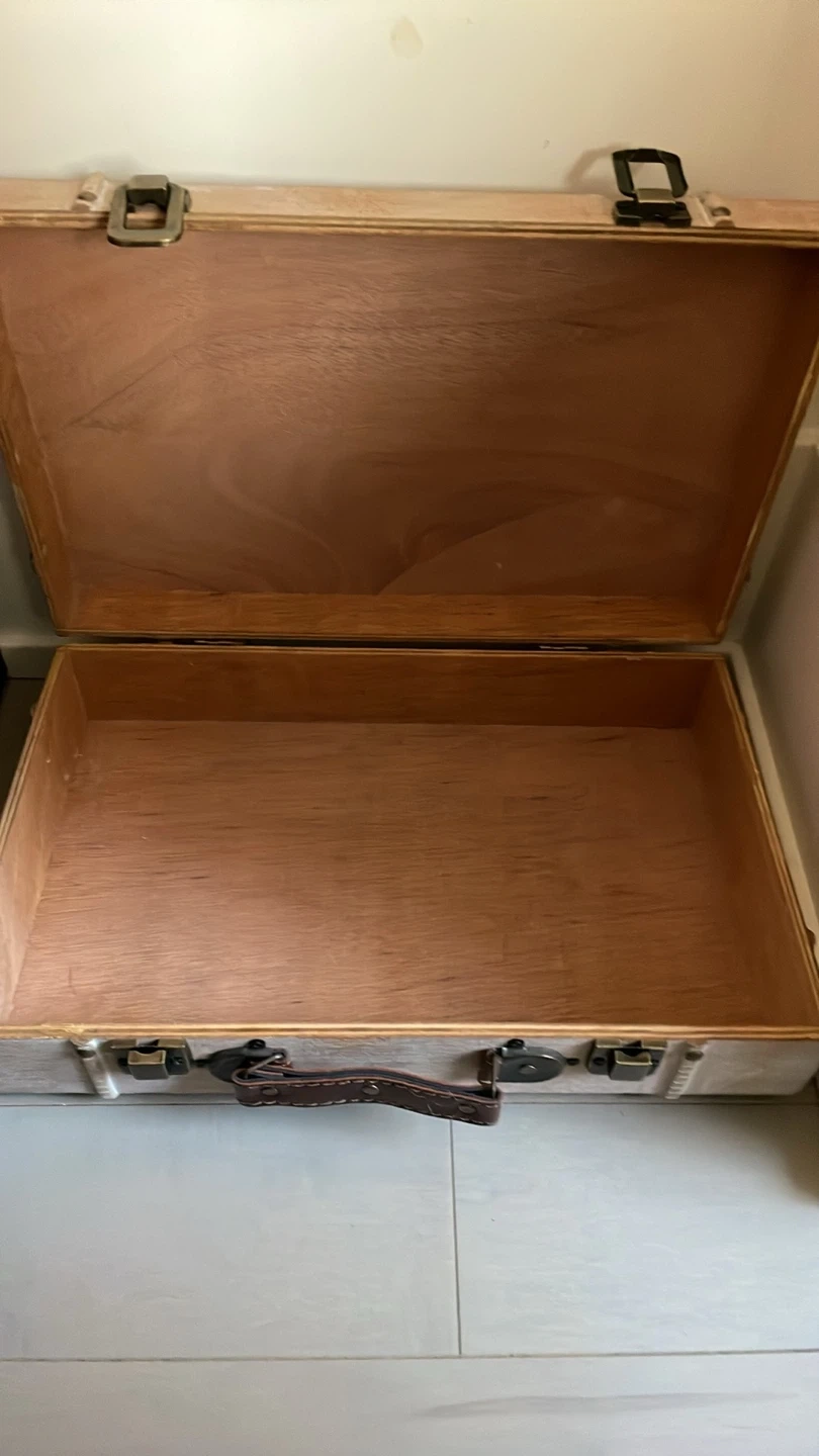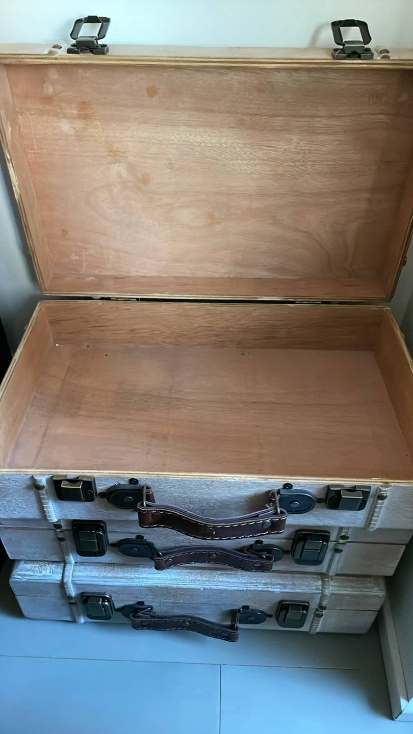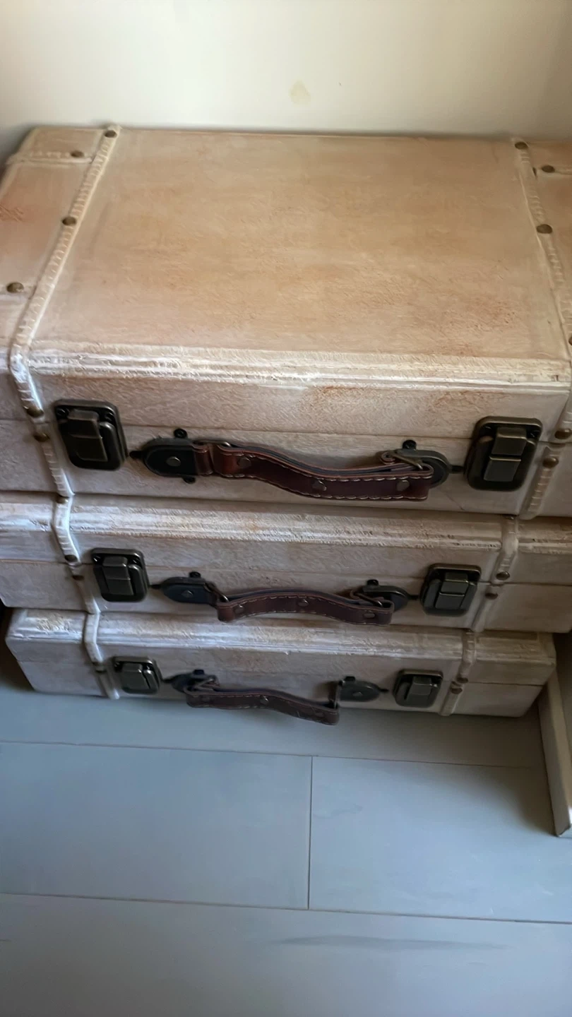 This is a decorative suitcase storage tower. It features four suitcase-style drawers, perfect for adding a vintage touch to your home decor. The tower is made of wood and has a distressed finish, giving it a rustic look. Each drawer has a handle, making it easy to open and close. It's great for storing various items while adding a unique style to your space
