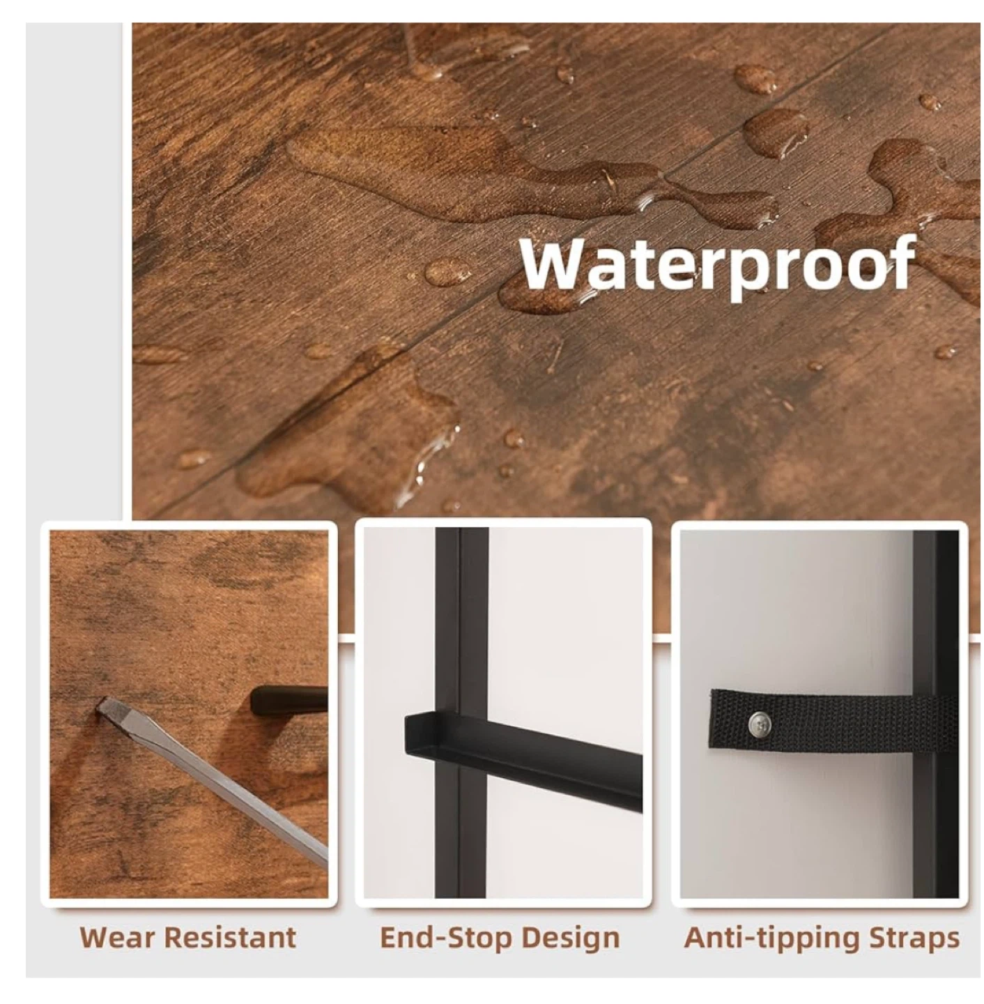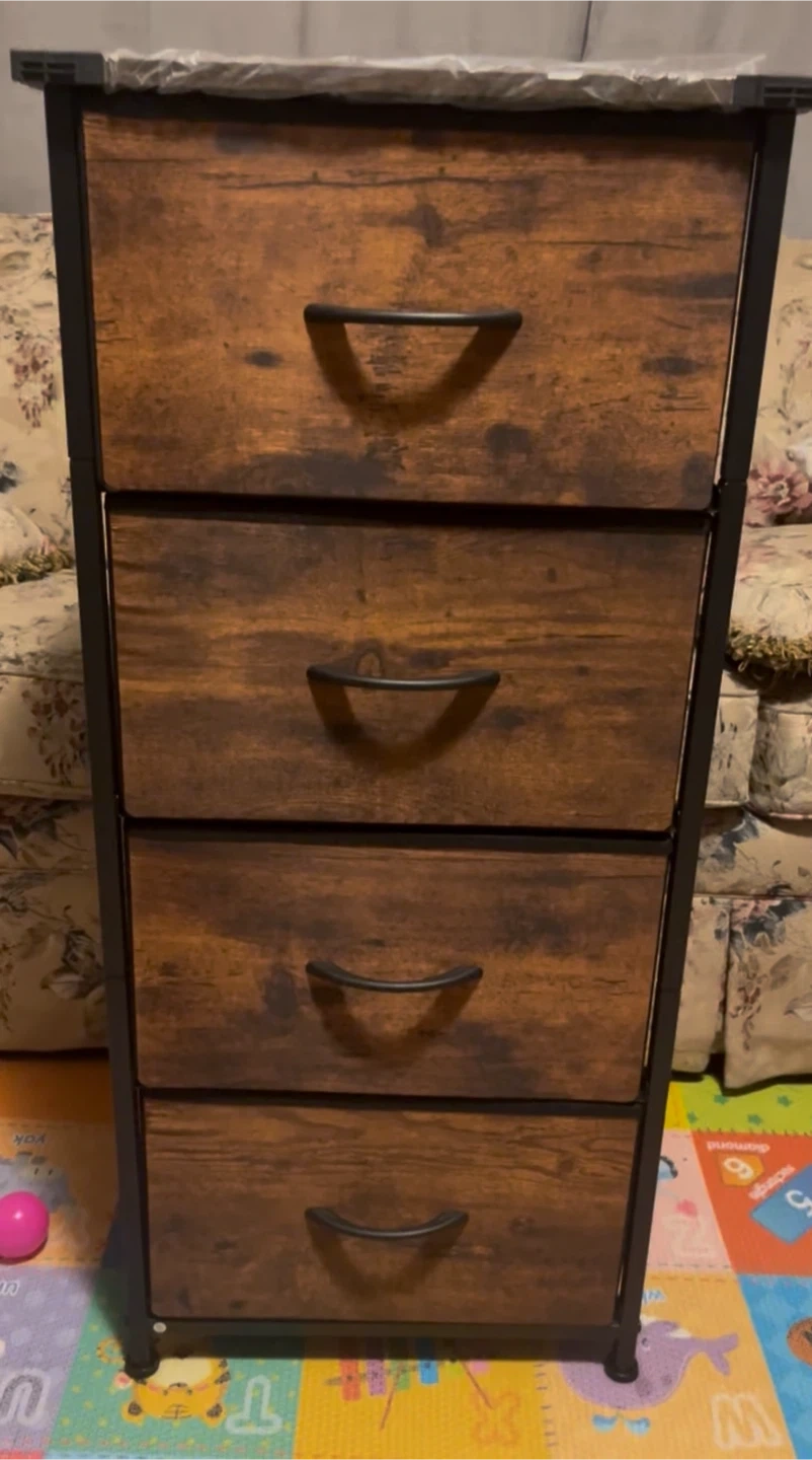 Looking to add some storage? This 4-drawer dresser is perfect for small spaces. It features a wood-look finish and a sturdy black metal frame. Each drawer can hold between 10-20 lbs. Dimensions are approximately 36.6" tall, 16.5" wide, and 11.8" deep. It's also waterproof, wear-resistant, and has anti-tipping straps for safety