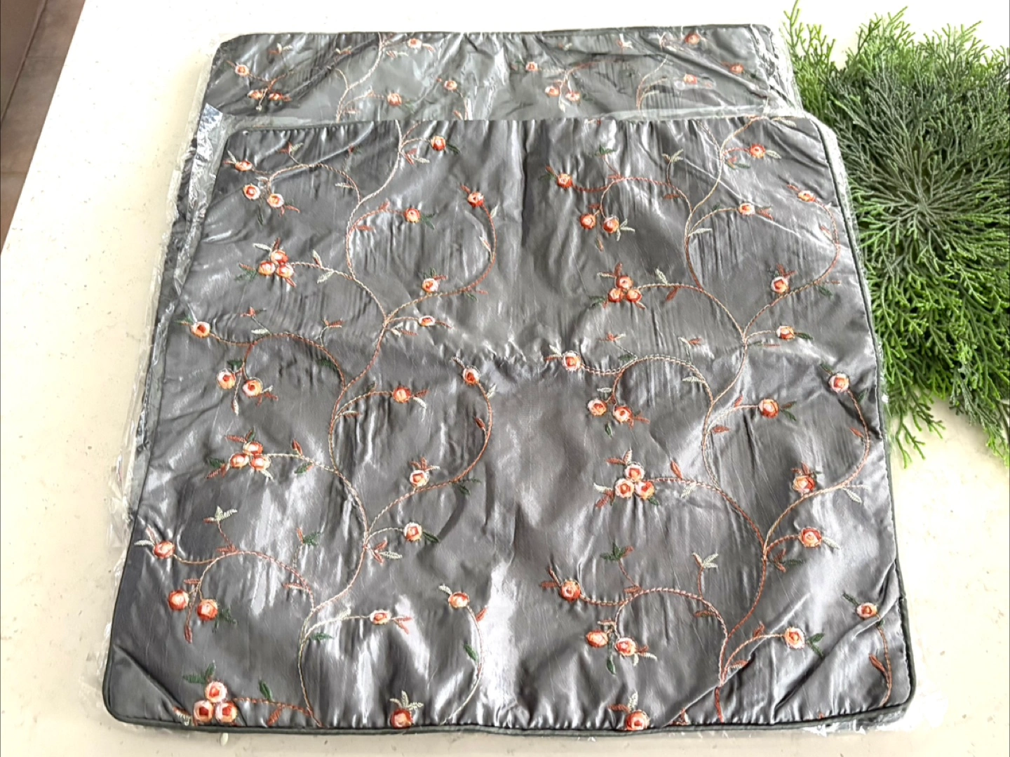 Add a touch of elegance to your home with this lovely satin silvery pillow cover! It features a delicate floral embroidery design that will brighten up any room. The cover is in brand new condition and ready to find a new home. It has a zipper closure to easily slide over your pillow insert and cleaning . 16” x 16”