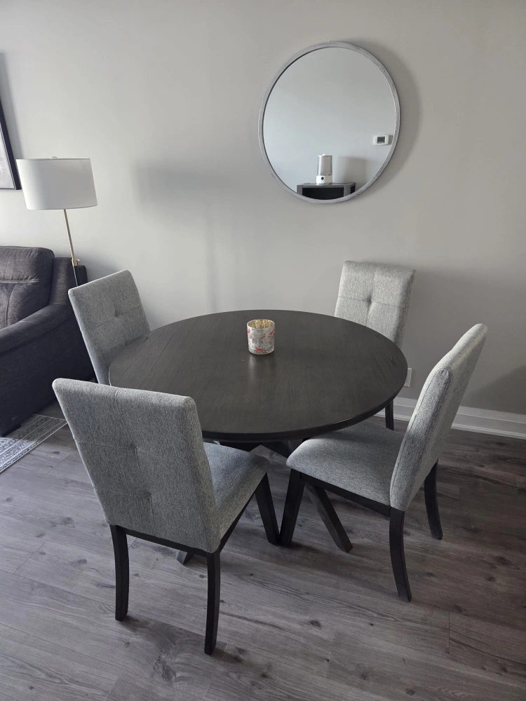 Must sell ,round dining table with four chairs. The table is a grey brown wood colour, and the chairs are upholstered in a light gray fabric. The set is in great condition and would be perfect for a small dining room or kitchen.