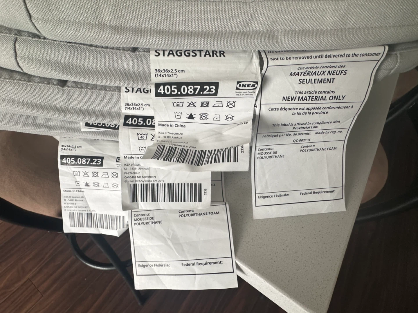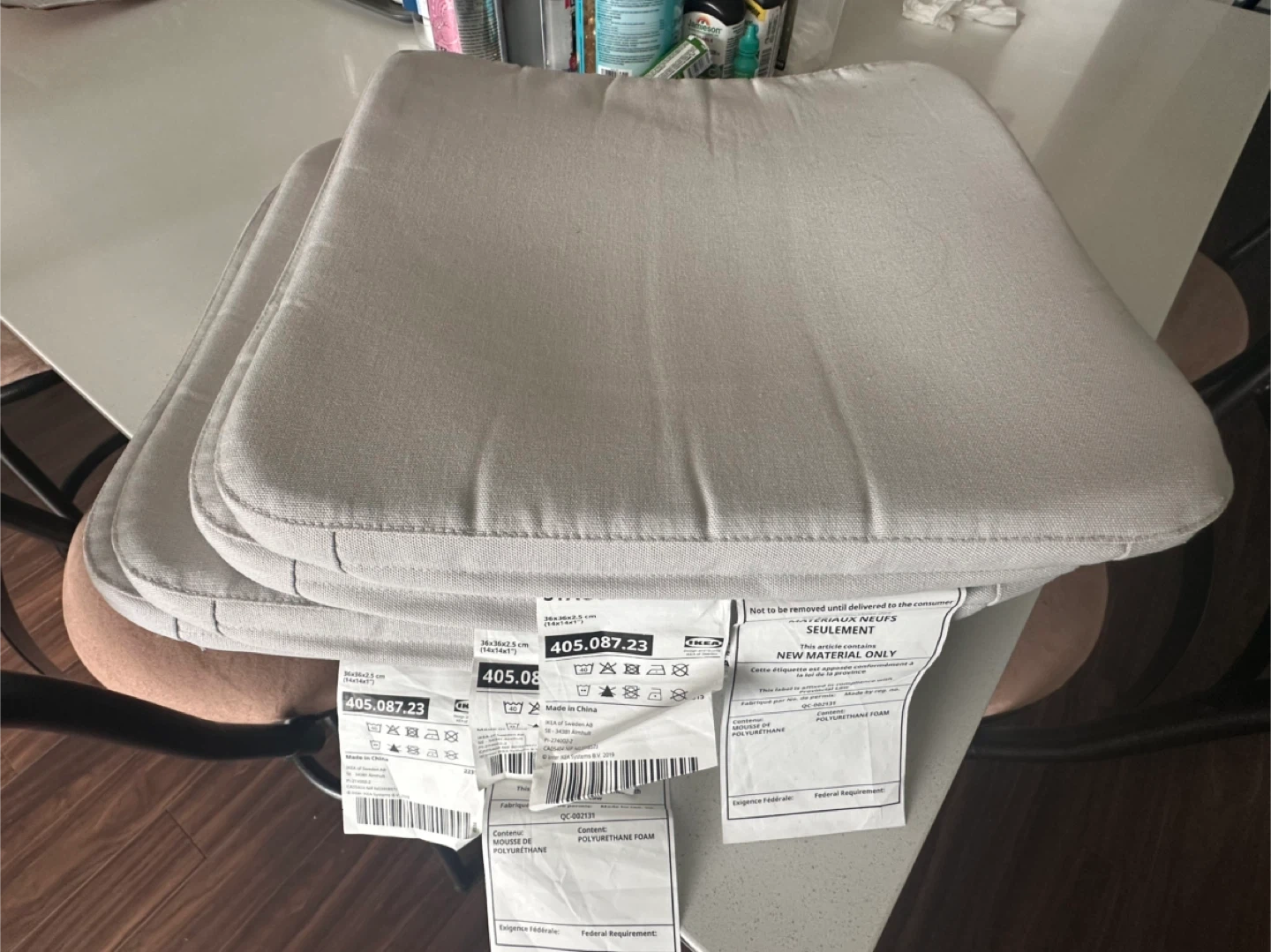 Selling a set of IKEA Staggstarr chair cushions. These are brand new and have never been used! Each cushion measures 36x36x2.5 cm (14x14x1"). They're made with polyurethane foam for comfortable seating.