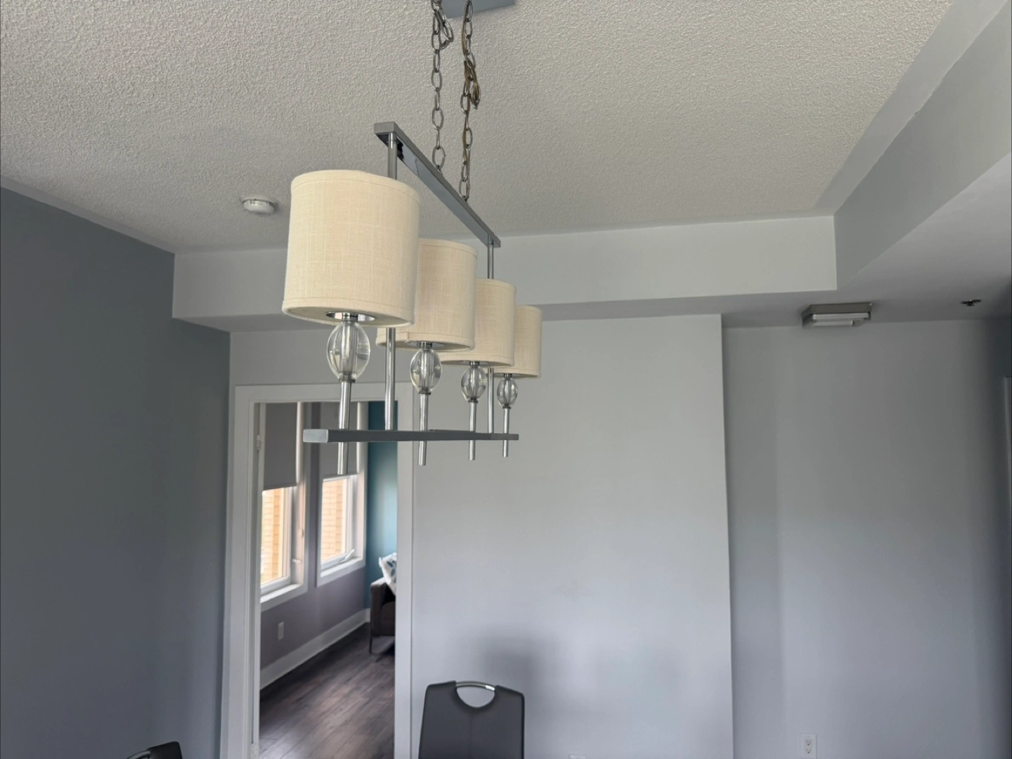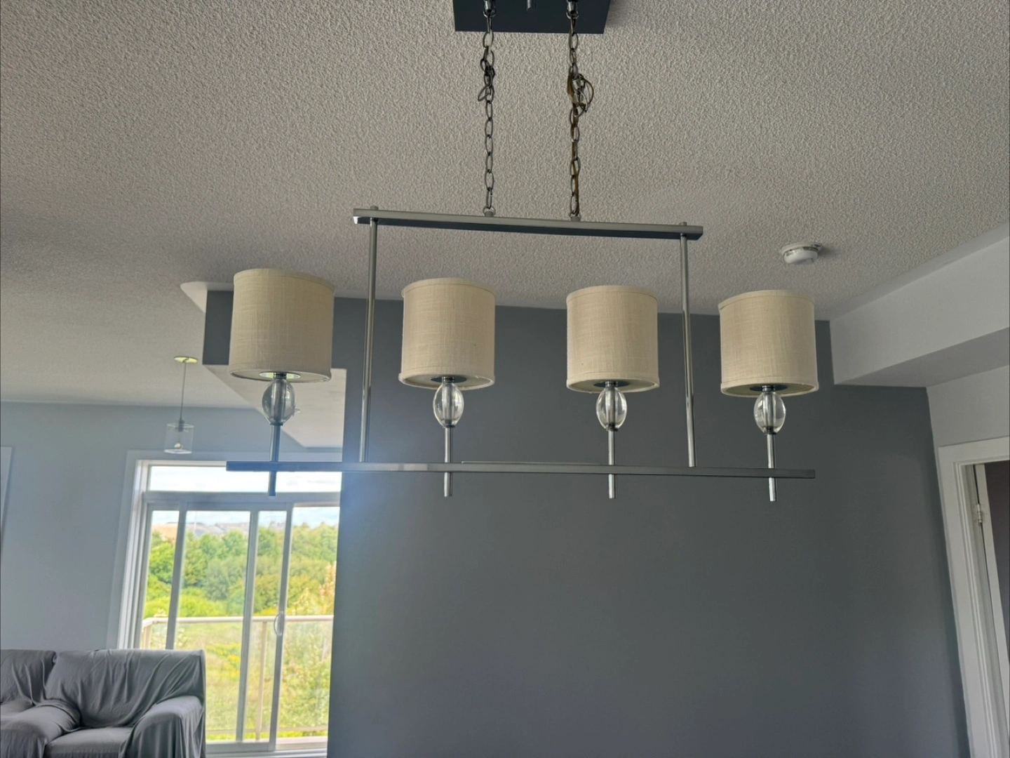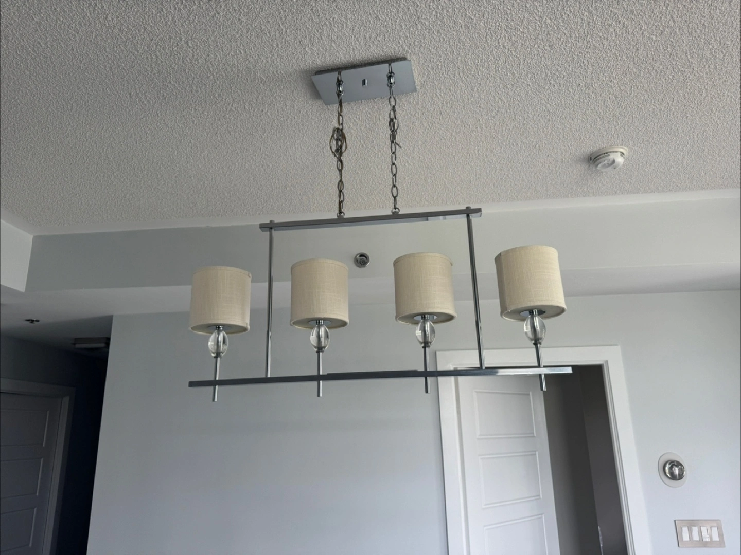Selling a stylish 4-light linear chandelier! It features a sleek design with four fabric shades and decorative crystal-like accents. Perfect for adding a touch of elegance to your dining room or kitchen island