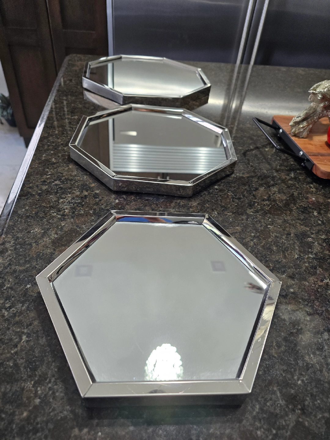 Selling a set of three octagon mirror trays! They are in great condition and would look lovely as decor or for serving