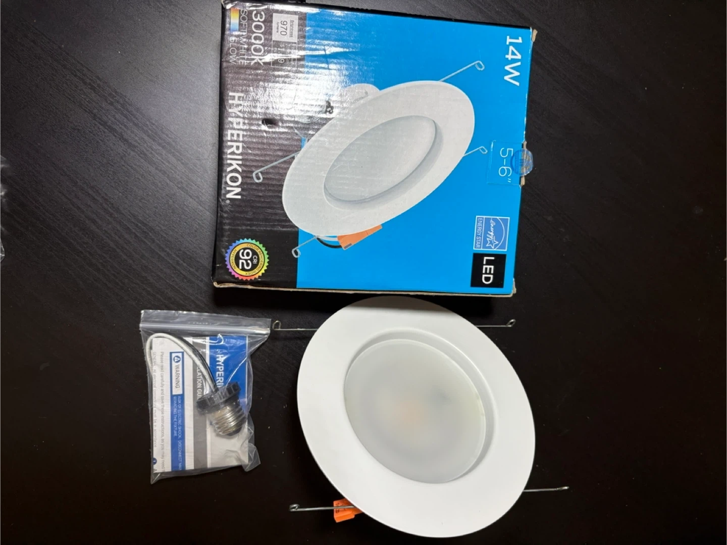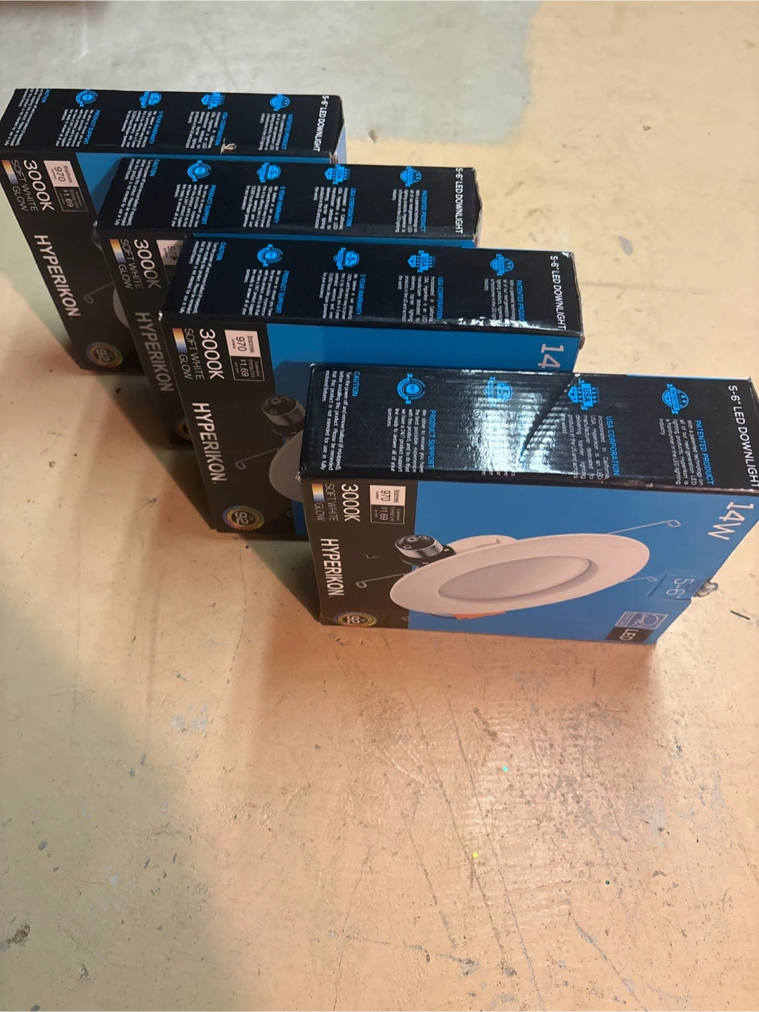Selling a set of 4 new Hyperikon 14W 5-6" LED 3000k downlight. It's still in its original packaging and includes all components. Perfect for adding some nice lighting to your home!