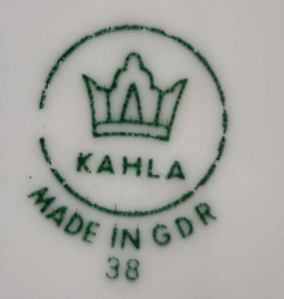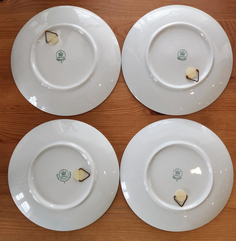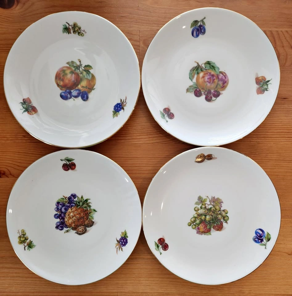Four Vintage Kahla made in German Democratic Republic (GDR) Porcelain Gold Rim Fruits Motif Plates. The 7 5/8 inch salad plates have mounting hooks, perfect to create a dining or kitchen wall decor grouping.