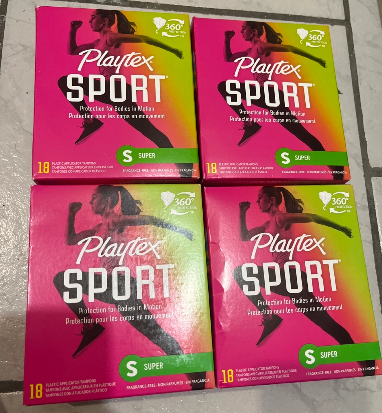 Four boxes of Playtex Sport Super tampons. Plastic applicator, fragrance-free. 18 count per box. Protection for bodies in motion. 4 X 15 *PICKUP NEAR JANE AND EGLINTON*