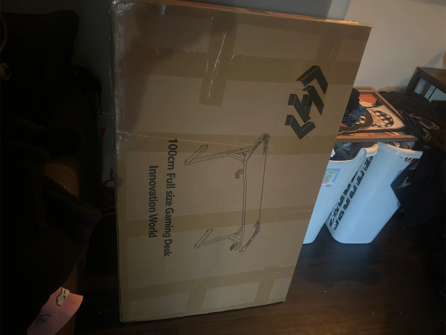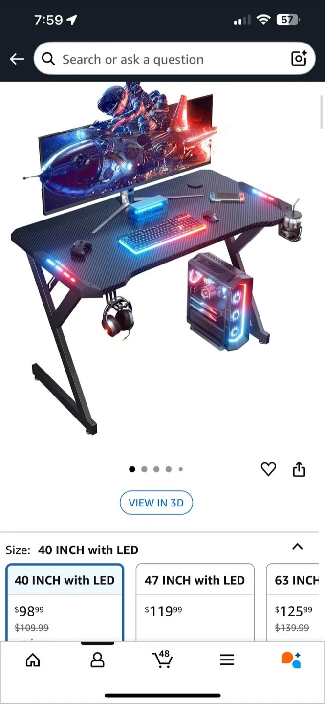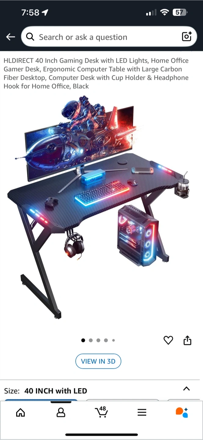 Selling a 40-inch gaming desk with LED lights. It also has a large carbon fiber desktop, a cup holder, and a headphone hook. The desk is black and comes in the original box purchased from Amazon never opened